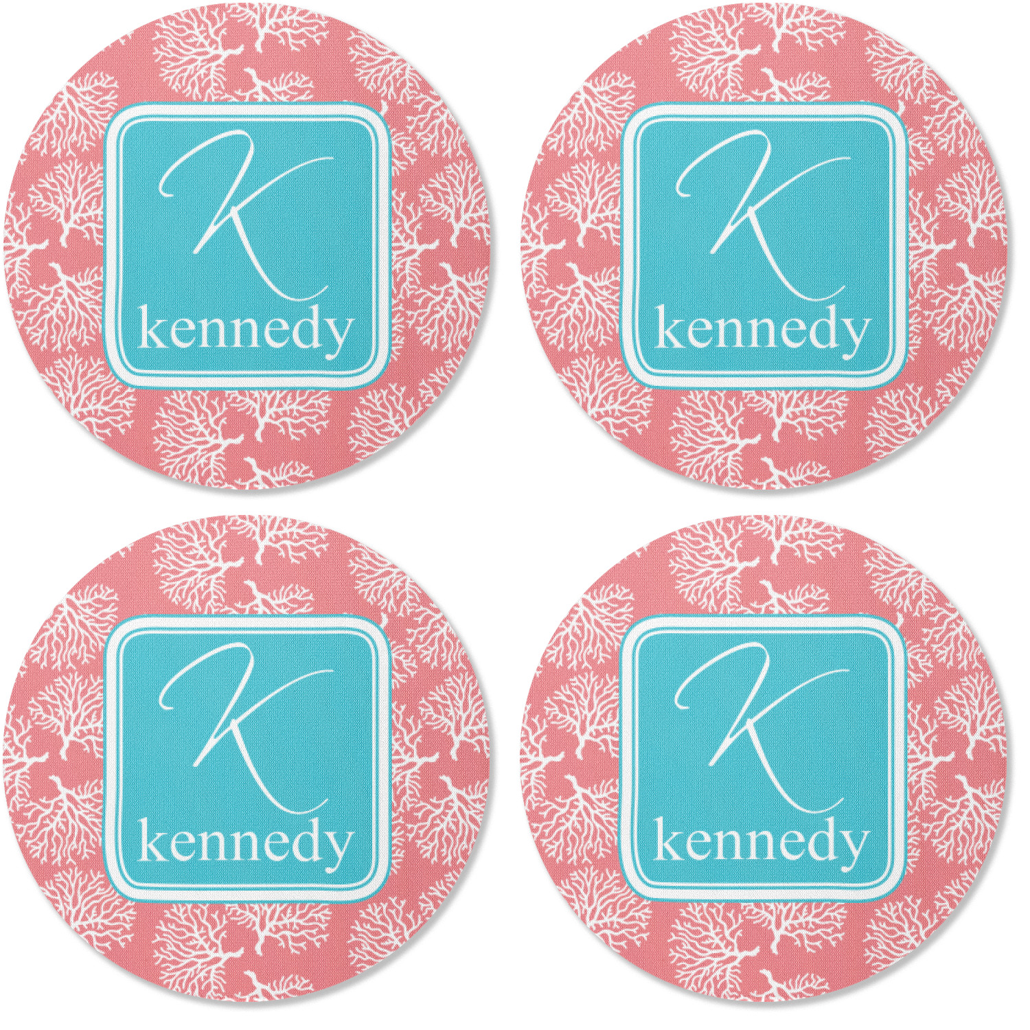 The coral background in this design is absolutely beautiful. The square label highlights the personalization of an initial and name of your choice in the stunning teal blue color.