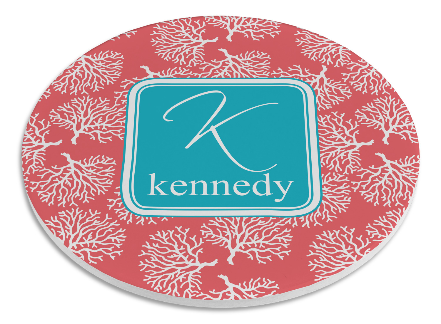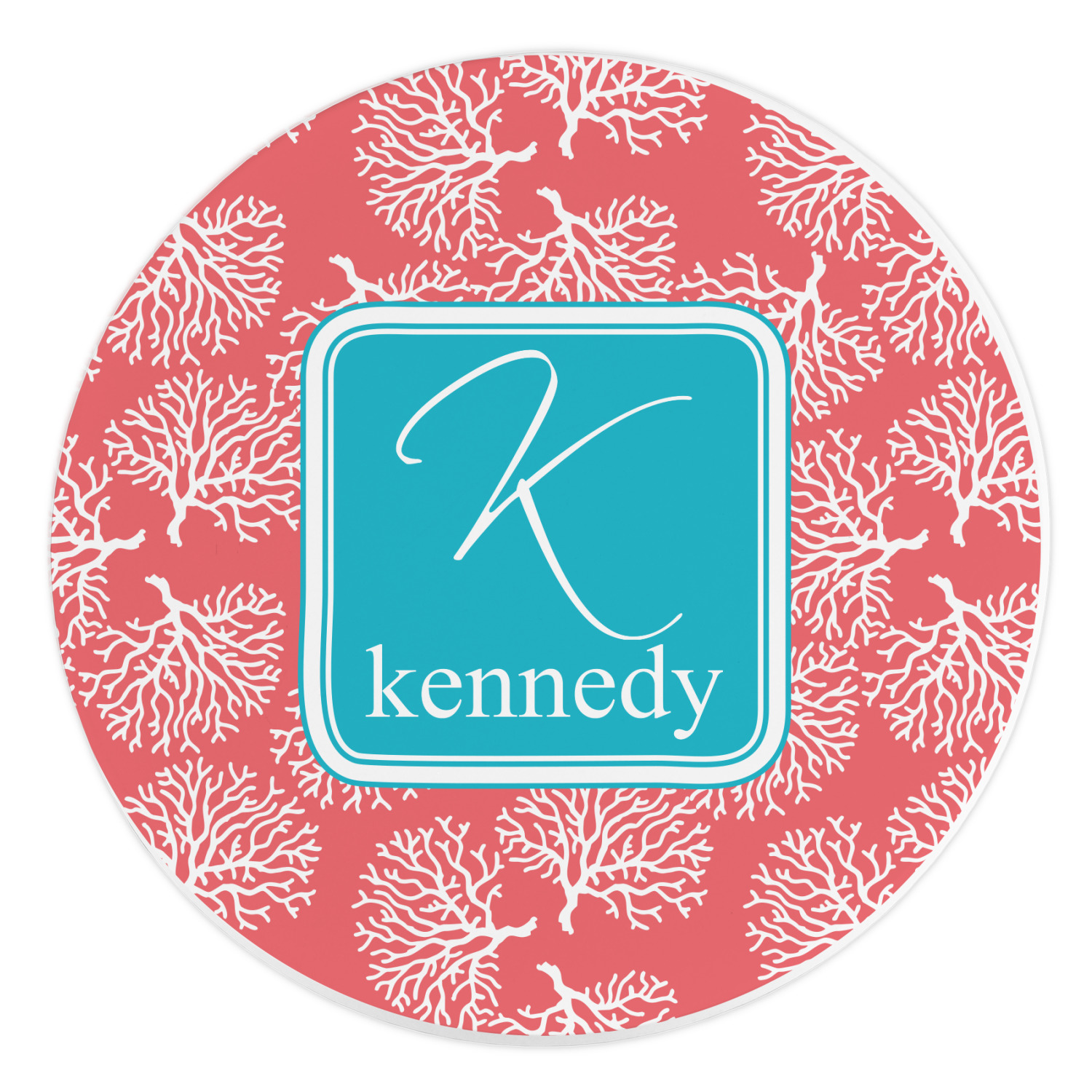 The coral background in this design is absolutely beautiful. The square label highlights the personalization of an initial and name of your choice in the stunning teal blue color.