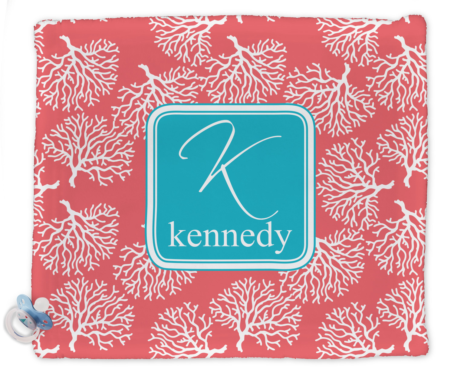 The coral background in this design is absolutely beautiful. The square label highlights the personalization of an initial and name of your choice in the stunning teal blue color.