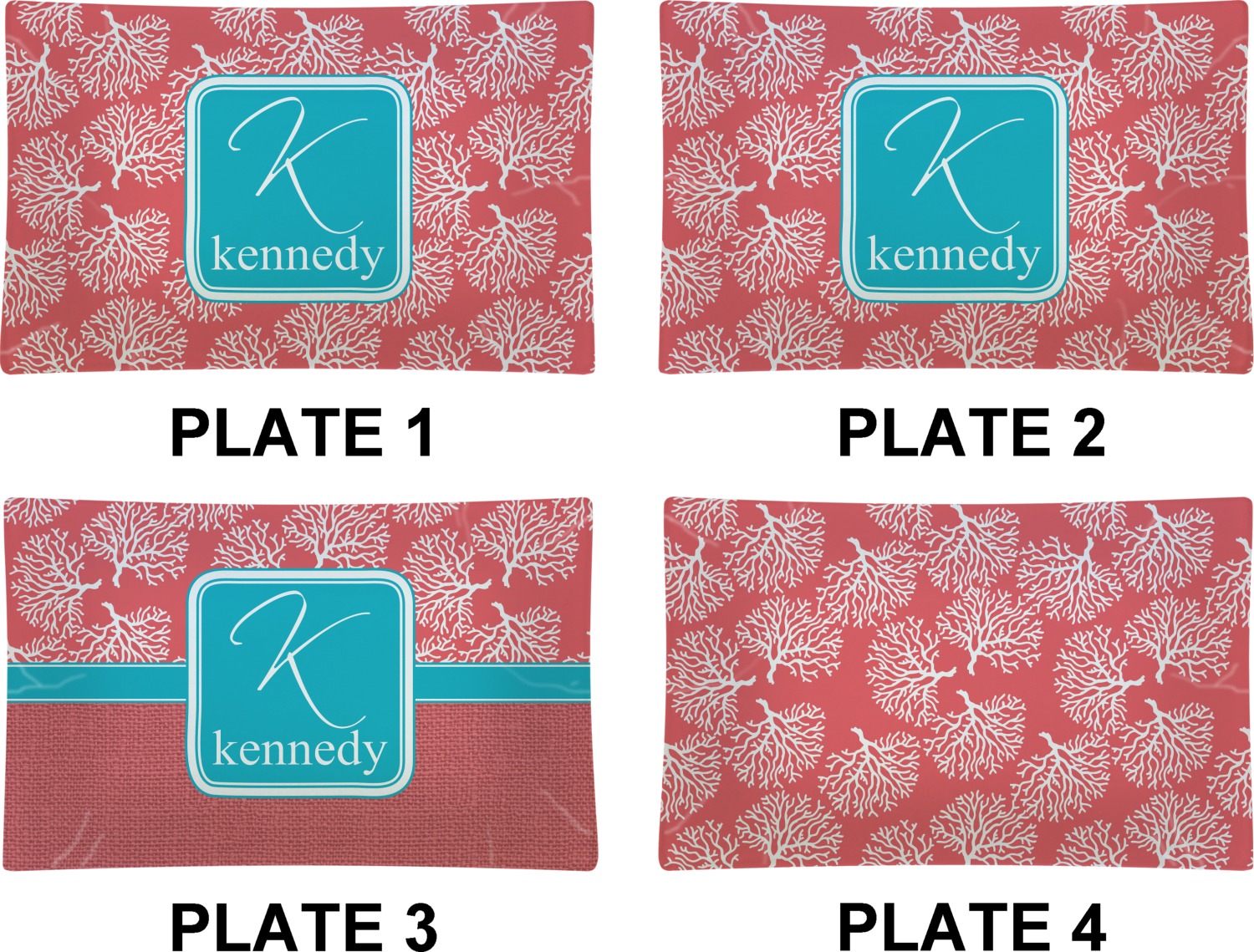 The coral background in this design is absolutely beautiful. The square label highlights the personalization of an initial and name of your choice in the stunning teal blue color.