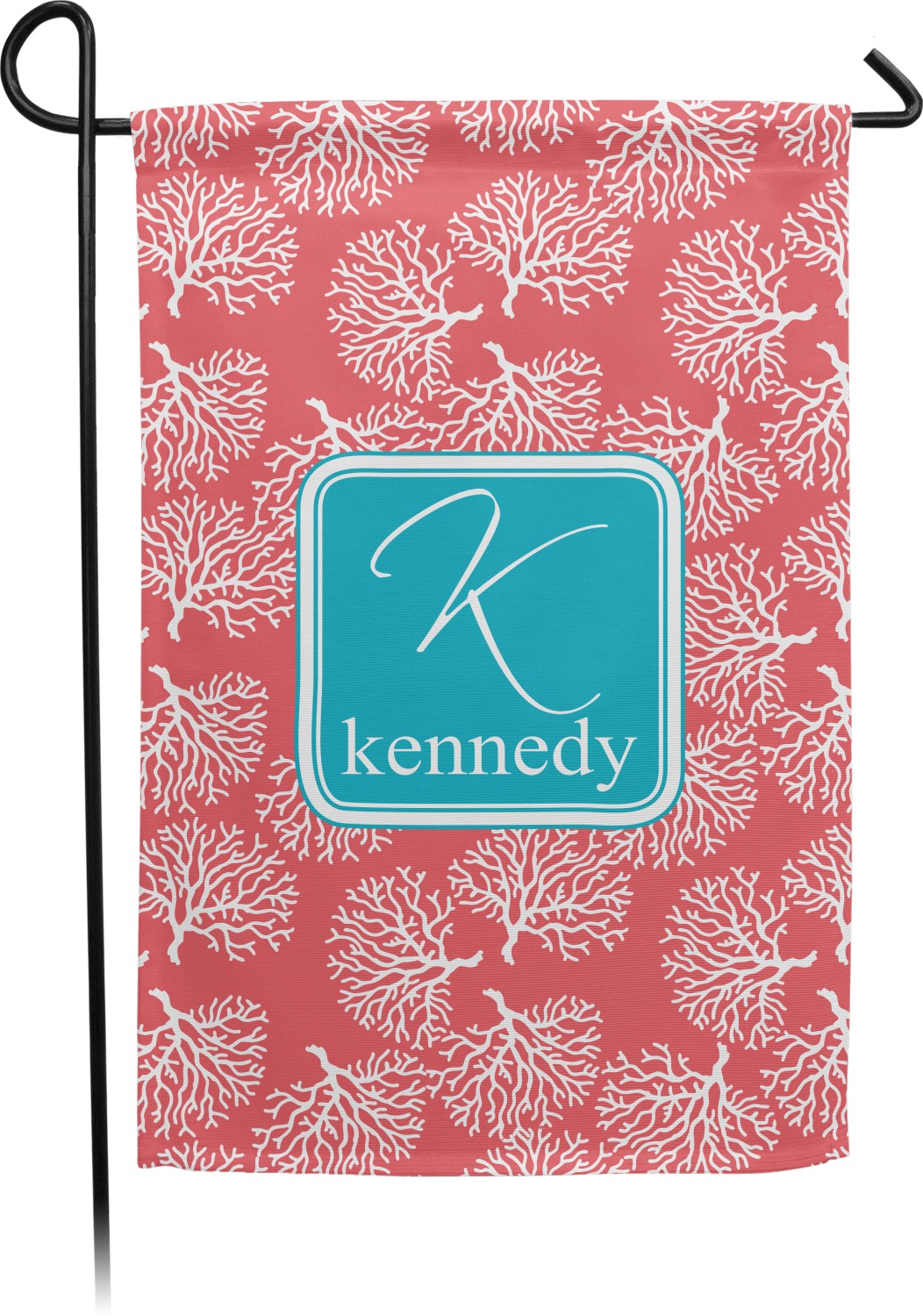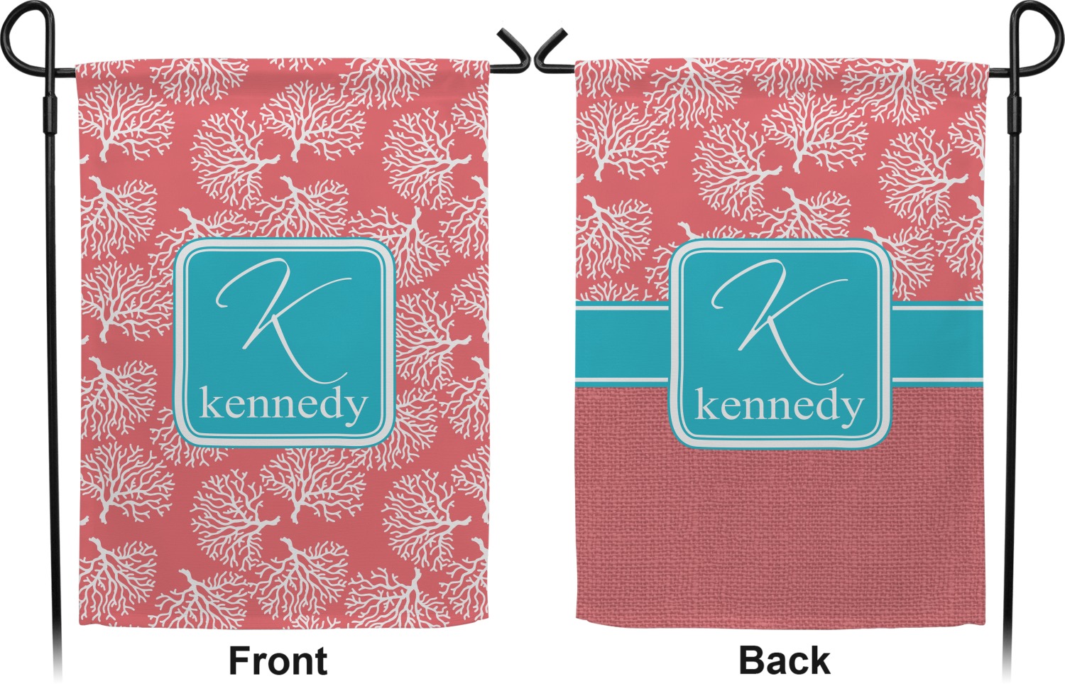 These custom garden flags are made of a durable, double-ply, polyester weave, allowing them to withstand the elements year round. The small flags measure at approximately 12 by 18 inches. The large flags measure out to 28 by 37 inches. You can order these decorative flags with your customization printed on the front only, or the front and back.