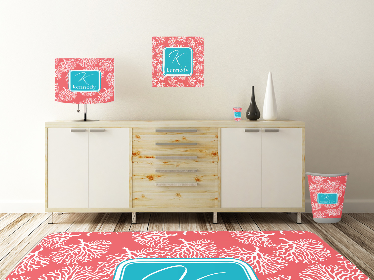 The coral background in this design is absolutely beautiful. The square label highlights the personalization of an initial and name of your choice in the stunning teal blue color.