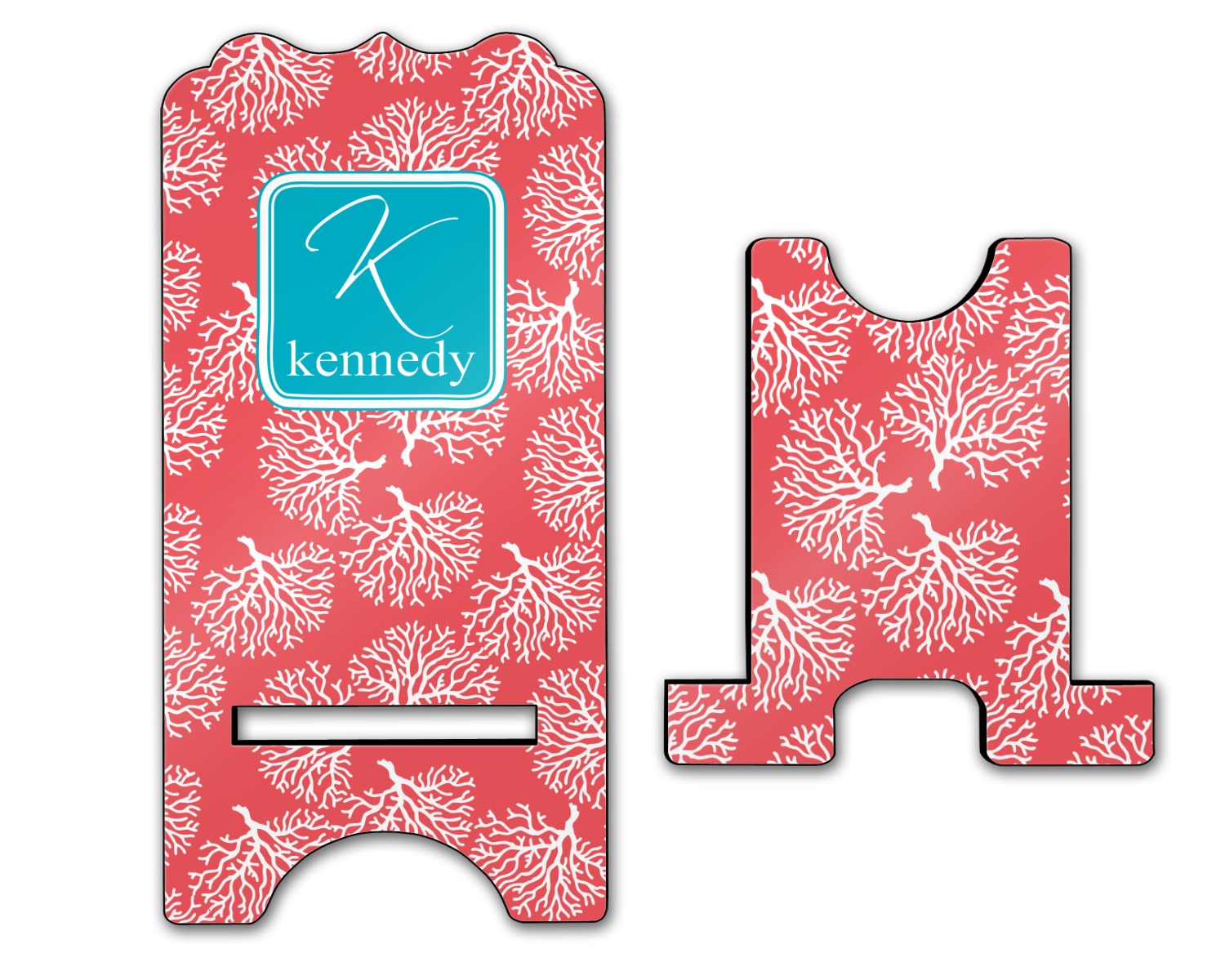 The coral background in this design is absolutely beautiful. The square label highlights the personalization of an initial and name of your choice in the stunning teal blue color.