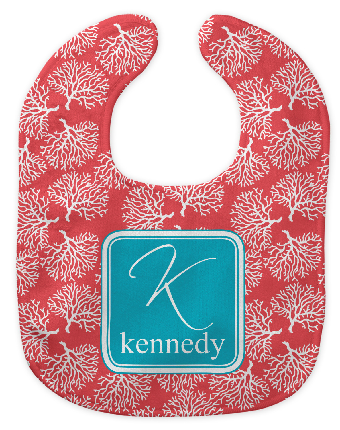 The coral background in this design is absolutely beautiful. The square label highlights the personalization of an initial and name of your choice in the stunning teal blue color.