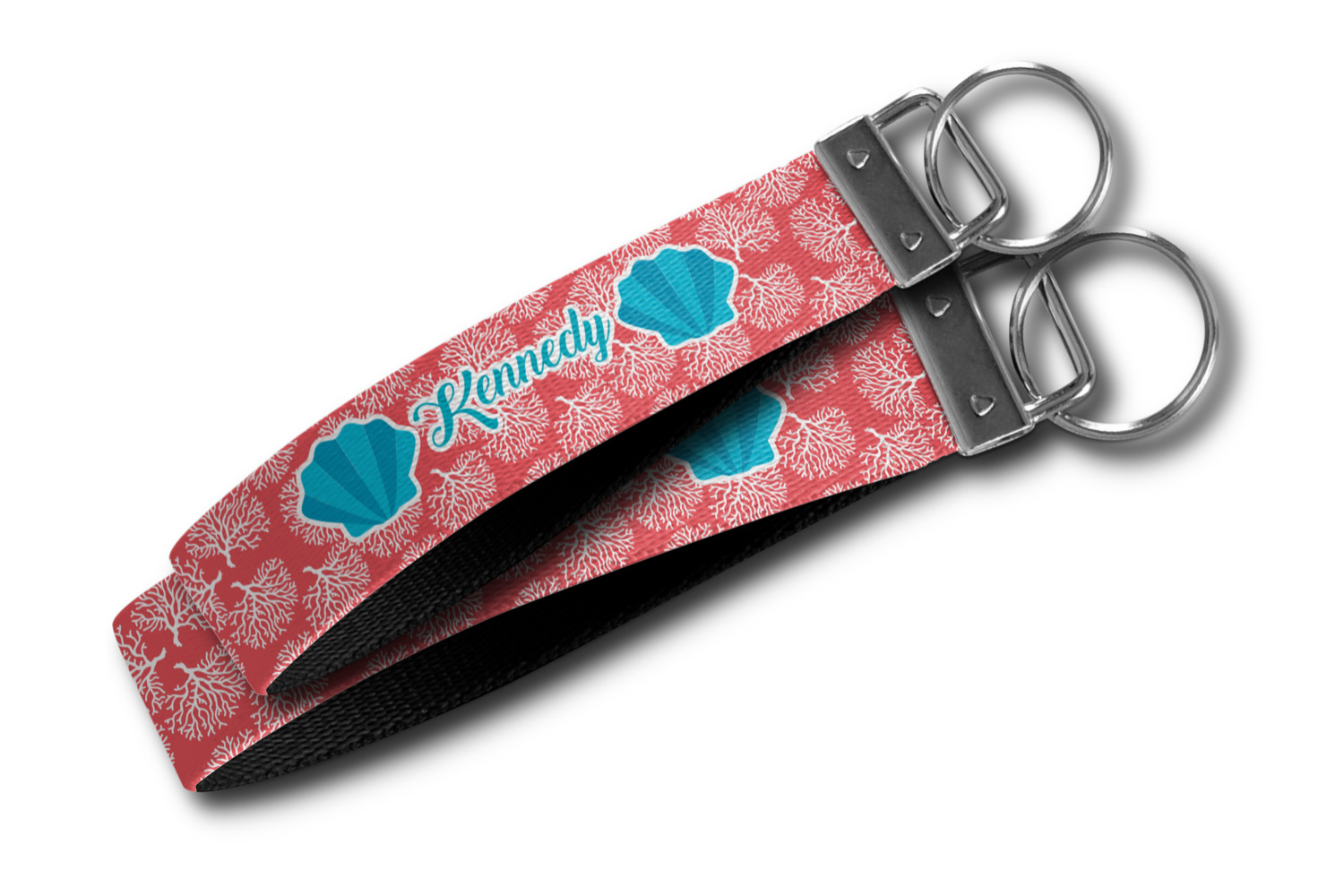 These key fob keychains are made from a polyester weave, right here in the USA. They feature a silver, metal clasp, attached to a round keyring. The piece gives the personalized wristlet a beautiful, finished look. Your customized design is printed on the outside of the keychain strap. We carry these wristlets in two sizes: small, which is 5 inches in width, and large, which is 5.5 inches in width.