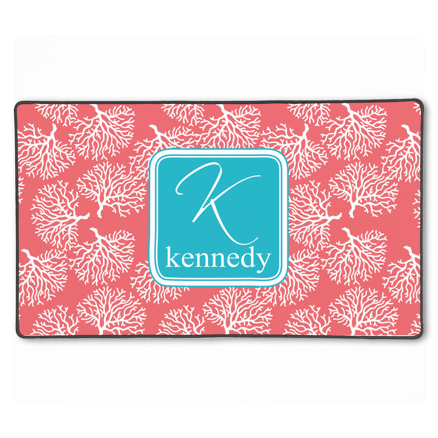 The coral background in this design is absolutely beautiful. The square label highlights the personalization of an initial and name of your choice in the stunning teal blue color.