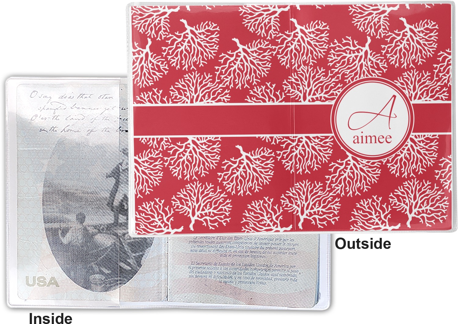 This cover is made of a sturdy clear vinyl with a personalized vinyl insert inside. There is a large and a small pocket on either side to hold the covers of your passport easily and firmly. The passport holder is approximately 7.5" x 5.25", the perfect size to snugly fit your passport. This slim cover is the perfect way to protect your passport without being one more bulky item you have to carry.