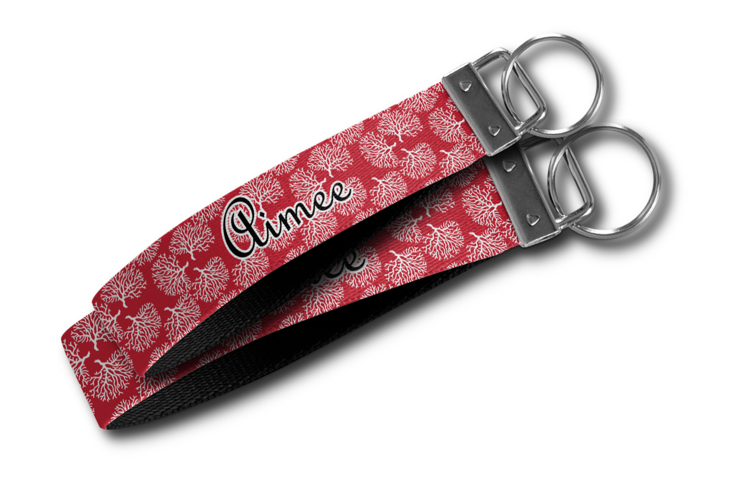 These key fob keychains are made from a polyester weave, right here in the USA. They feature a silver, metal clasp, attached to a round keyring. The piece gives the personalized wristlet a beautiful, finished look. Your customized design is printed on the outside of the keychain strap. We carry these wristlets in two sizes: small, which is 5 inches in width, and large, which is 5.5 inches in width.