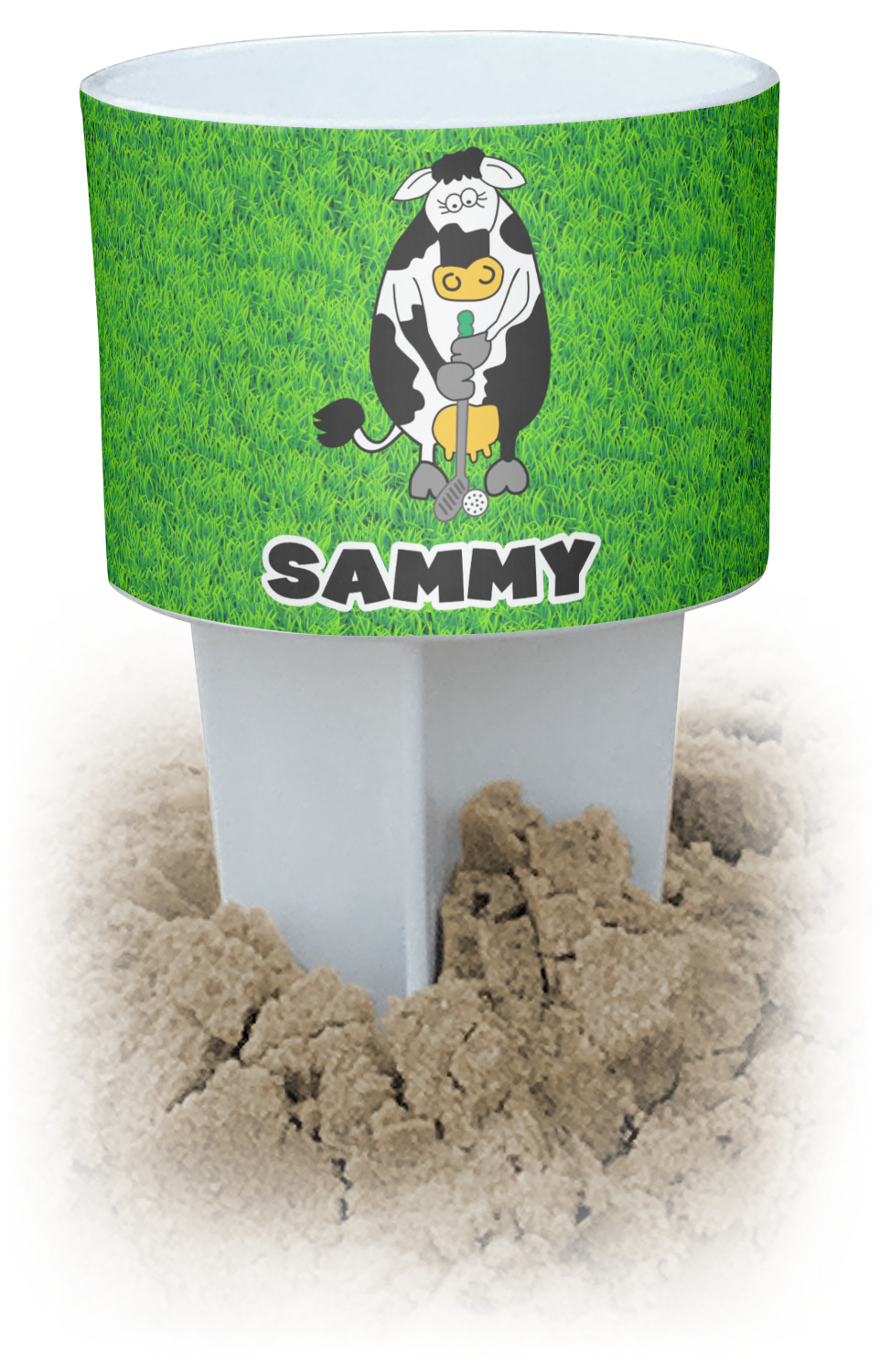 This cup holder has a large stake at its bottom that anchors it to the sand or ground below, while the cup holder rests above the stake. The entire drink holder is made of durable plastic and displays your customization around the cup holder portion. We sell these personalized beach spikers in two different colors: black and white.