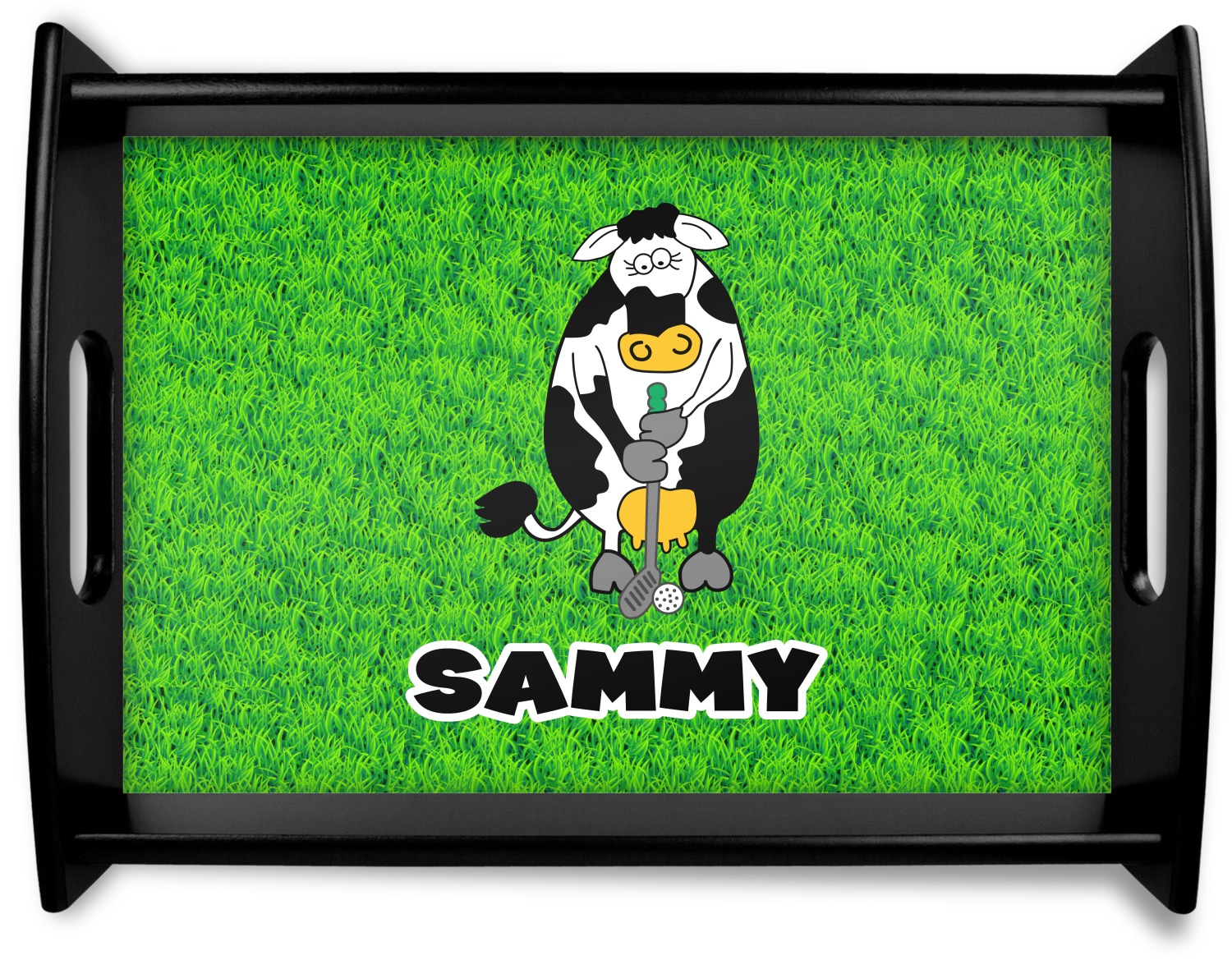 This serving tray with handles features square edges and two rounded sides, creating a very modern look. Each side is fabricated from a beautifully cut, natural wood. The bottom of the interior of the tray displays your customized design in bright, vibrant color. The tray is sold in both a black color and a natural wood look. Each variation of the wood serving tray has two sizes: Small, which is 14" x 10" x 2.25", and Large, which is 19.5" x 13.5" x 2.75".