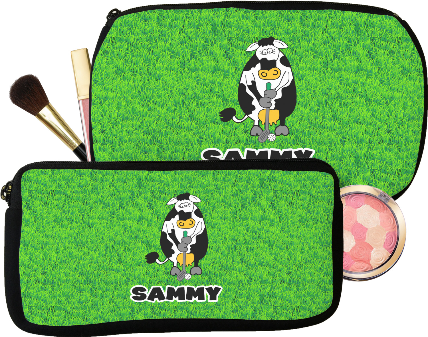 Our personalized makeup bags are available in many different designs, patterns and colors - so you are sure to find one that will love. They are made of neoprene (same material as wet-suits) and thus are water resistant, so spillages in your makeup bag will not end up all over you purse. They are customized on one side and are black on the other side and the zipper is black as well.