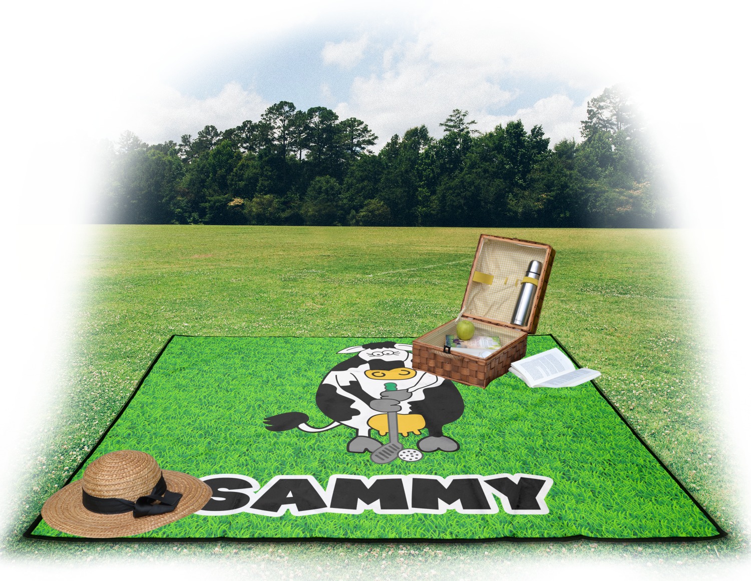 This picnic blanket is perfect for hanging out with your friends at the park or anywhere outside. The top of the blanket is made of a super soft microfiber fleece. The bottom of the blanket is made of a black material similar to a rain jacket and is water repellent as well. This will keep any wet spots on the ground from soaking through your picnic blanket. No one likes a wet blanket. The blanket measures at approximately 50" x 59" and has a nicely finished ribbon edge.