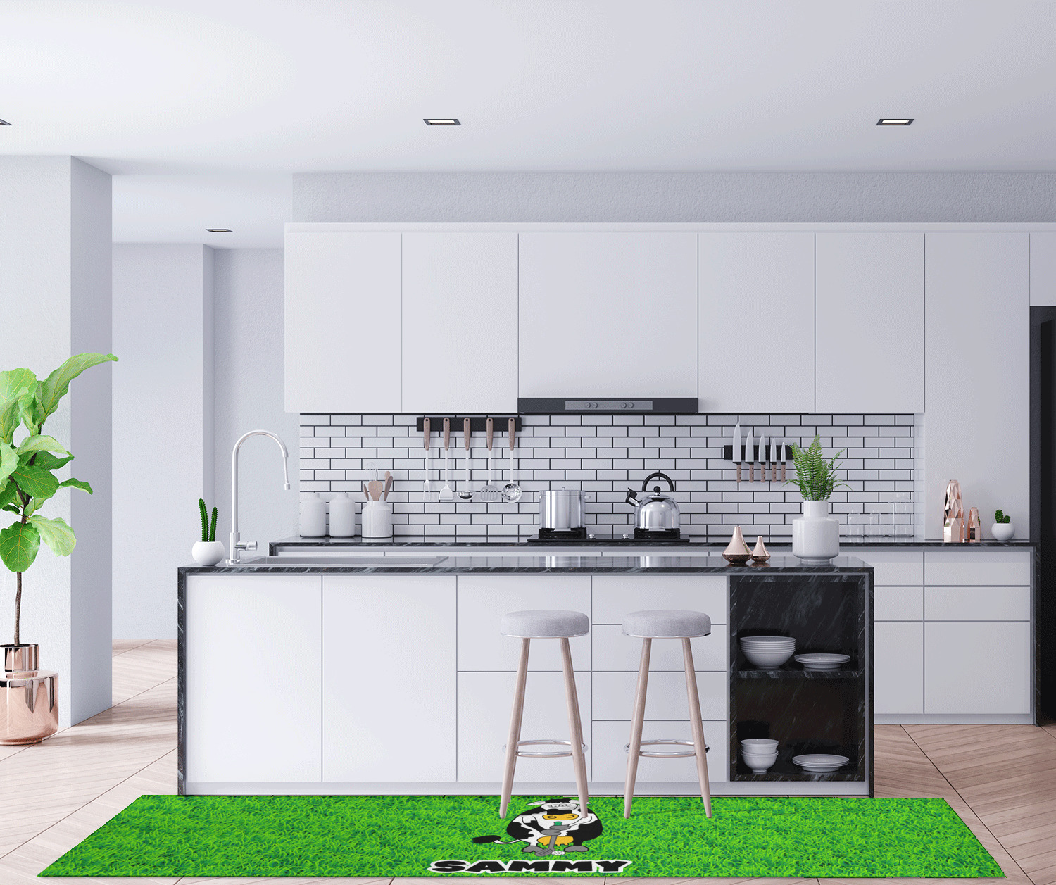 If you want to design it for your hallway - a vertical design is the perfect fit. If designing for to go in front of your kitchen island a horizontal design would suit you best! In our design system you can rotate the design either way to get the product you want.