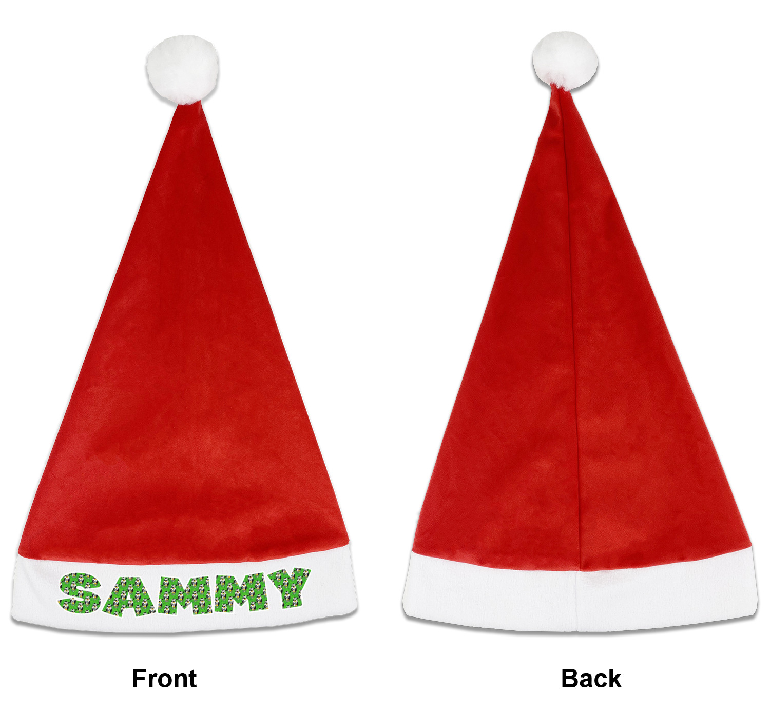 Our Santa hats are a soft, velvety polyester material. These customizable Santa hats are a classic red with white brimming and pom pom ball hanging off the hat tail just like Santa Claus! Each personalized Santa hat is approximately 17.5 L x 11.8 W. We offer two different styles to print your designs on the white brim - front or front & back.