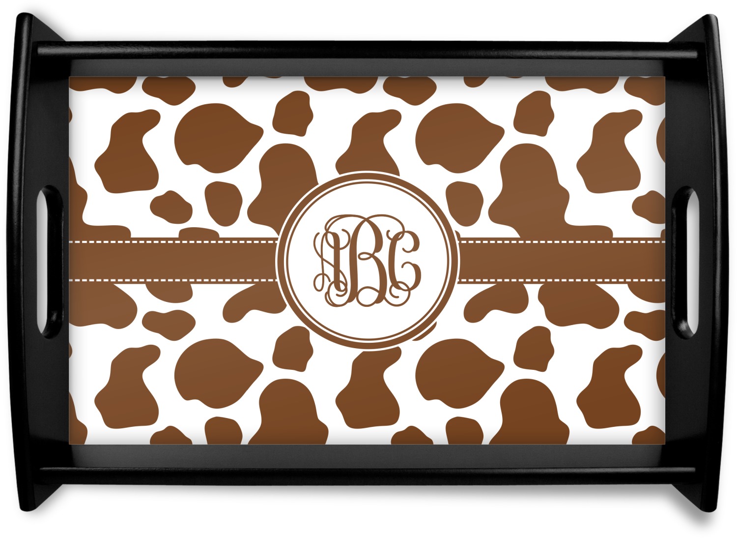 This serving tray with handles features square edges and two rounded sides, creating a very modern look. Each side is fabricated from a beautifully cut, natural wood. The bottom of the interior of the tray displays your customized design in bright, vibrant color. The tray is sold in both a black color and a natural wood look. Each variation of the wood serving tray has two sizes: Small, which is 14" x 10" x 2.25", and Large, which is 19.5" x 13.5" x 2.75".