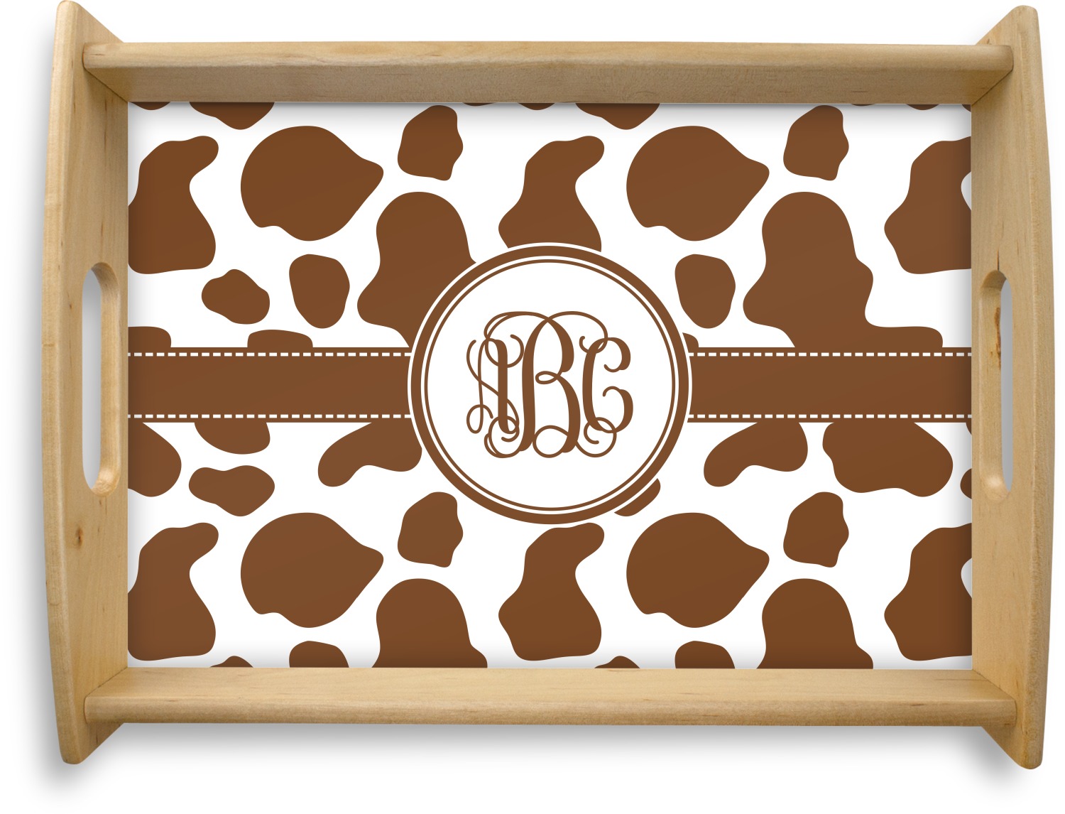 This serving tray with handles features square edges and two rounded sides, creating a very modern look. Each side is fabricated from a beautifully cut, natural wood. The bottom of the interior of the tray displays your customized design in bright, vibrant color. The tray is sold in both a black color and a natural wood look. Each variation of the wood serving tray has two sizes: Small, which is 14" x 10" x 2.25", and Large, which is 19.5" x 13.5" x 2.75".