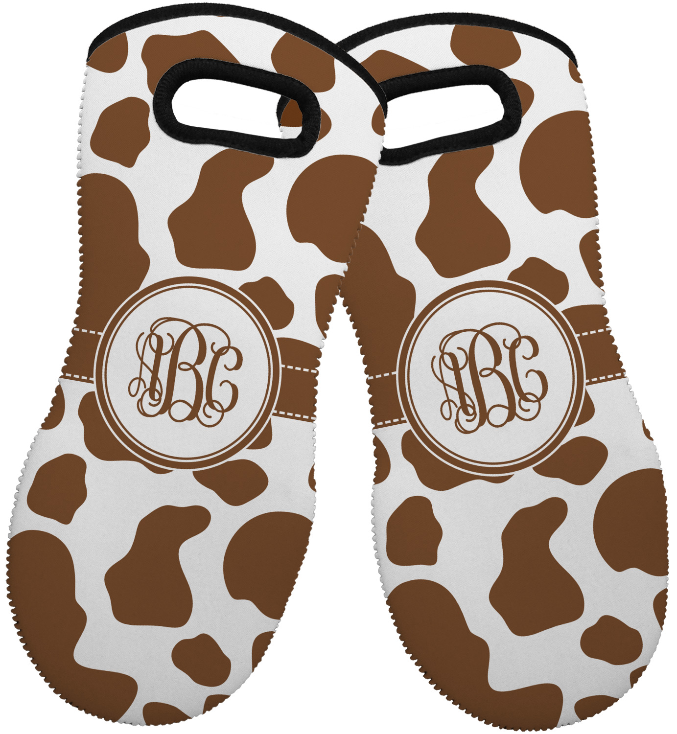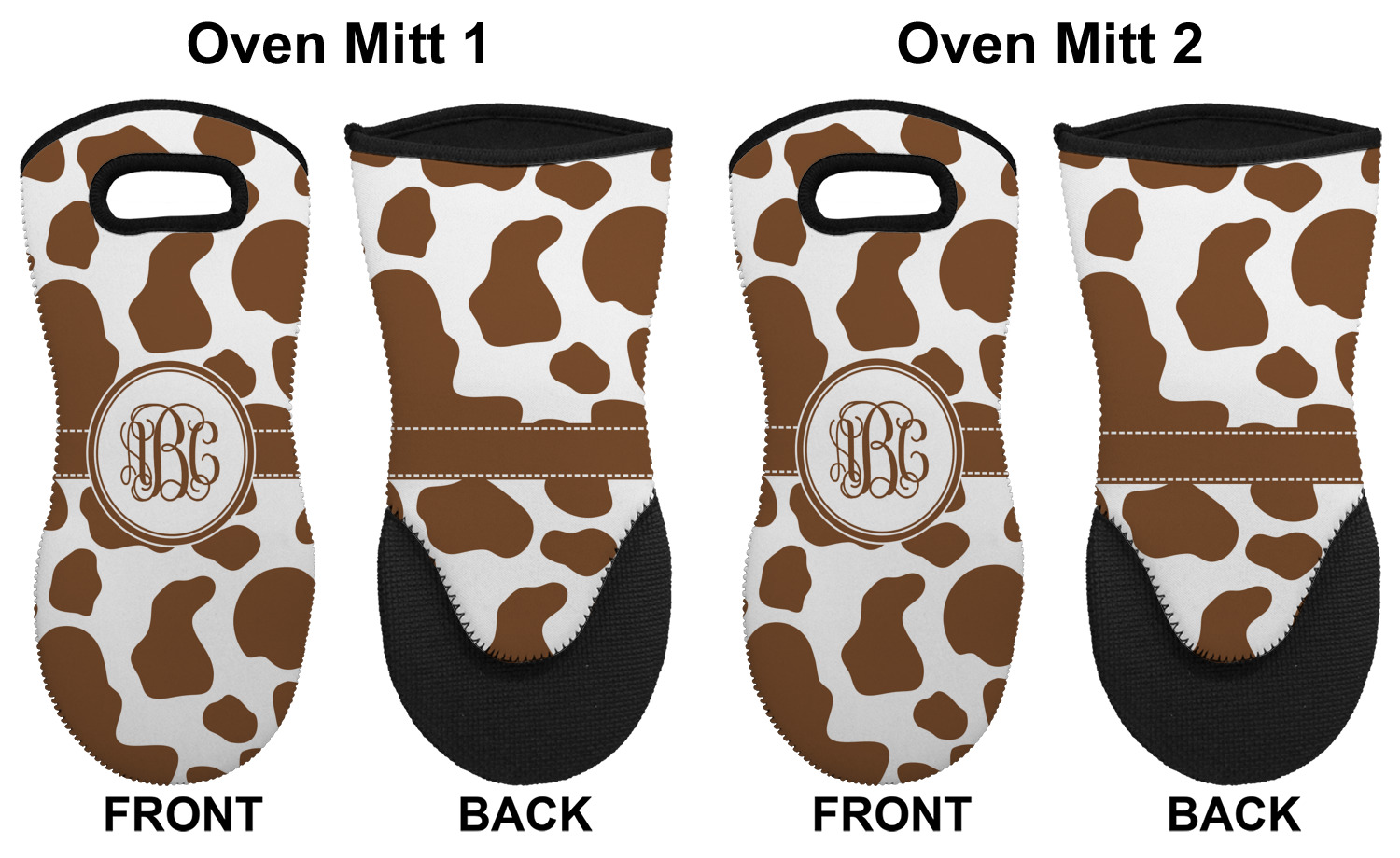These heat resistant gloves are made entirely of a durable neoprene; the front features a softer texture, while the palm's side has a textured surface, meant to handle heat up to 500 degrees Fahrenheit. Thick, heavy duty stitching connects the two sides. A small, oval cutout appears on the front, and can be used to hang and store the mitt. Your personalization appears on the front, and the upper part of the back of the mitt. The style of these oven mitts are suitable for both the right and left hand, depending on your needs. If you need one for each hand, be sure to order two!