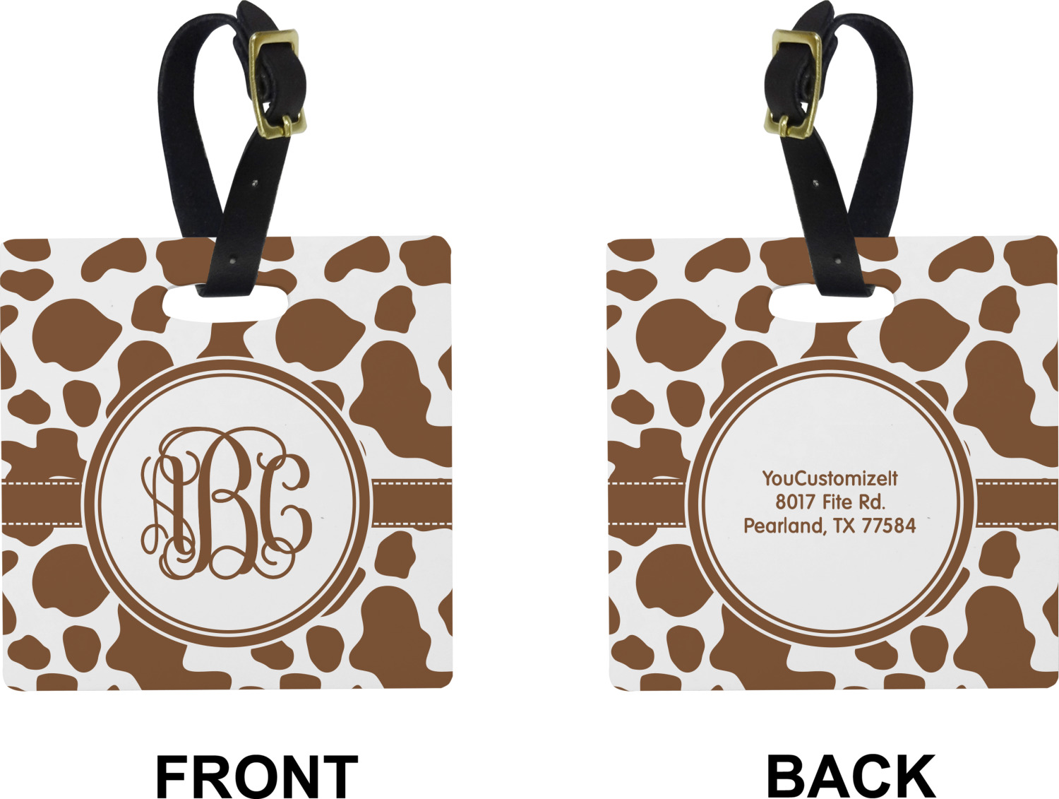 These personalized bag tags are sold in a variety of shapes, so that you may find the product that meets your vision exactly. We sell a round luggage tag, which measures at approximately 4" x 4". Our square luggage tag is about 3.5" x 3.5", while our rectangular version is 2.75" x 4 ".