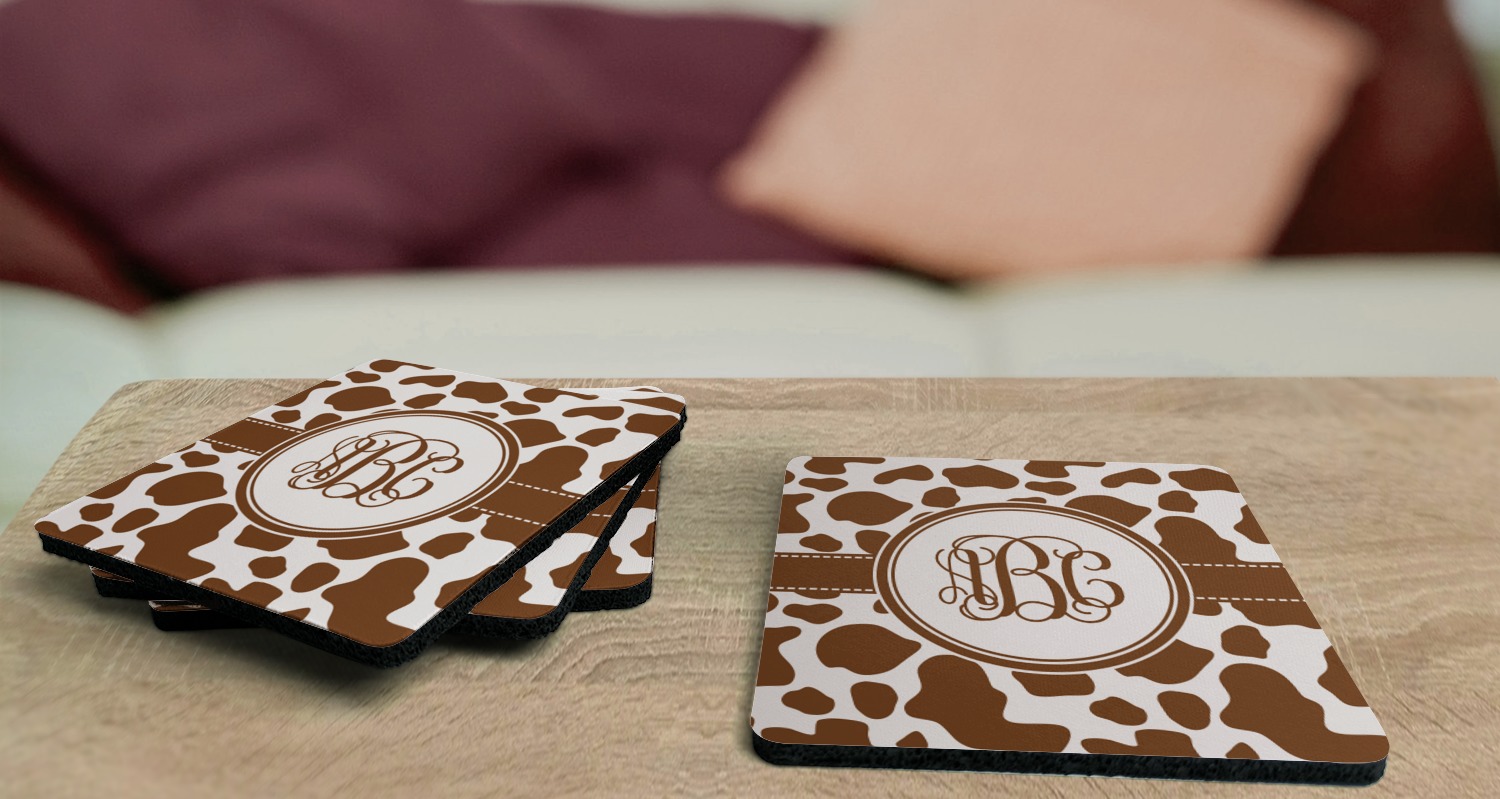 These drink coasters have a smooth, polyester top and a textured, rubber backing on its bottom. The non-slip rubber backing underneath works to keep any spills at bay. At 4 by 4 by 0.25 inches thick, these custom coasters are a suitable size for most drinkware. Your personalization is displayed atop the face of the cup coaster. We sell these rubber coasters in two different shapes: square and round. You can buy each shape as singulars or as a set of 4.