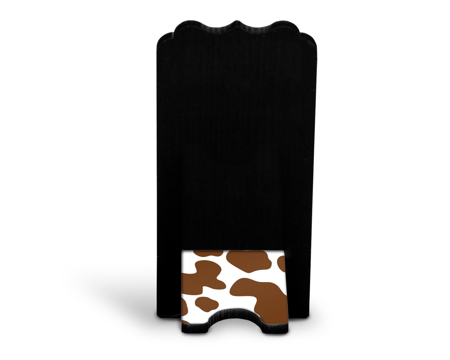 These cell phone holders are comprised of two hardboard pieces, that lock into and steady one another. The bottom part of the mobile phone stand is spacious enough to support both your phone and your charger, while it is not in use. We print your customization atop the face of this stand, while the remaining sides are a sophisticated, black color.