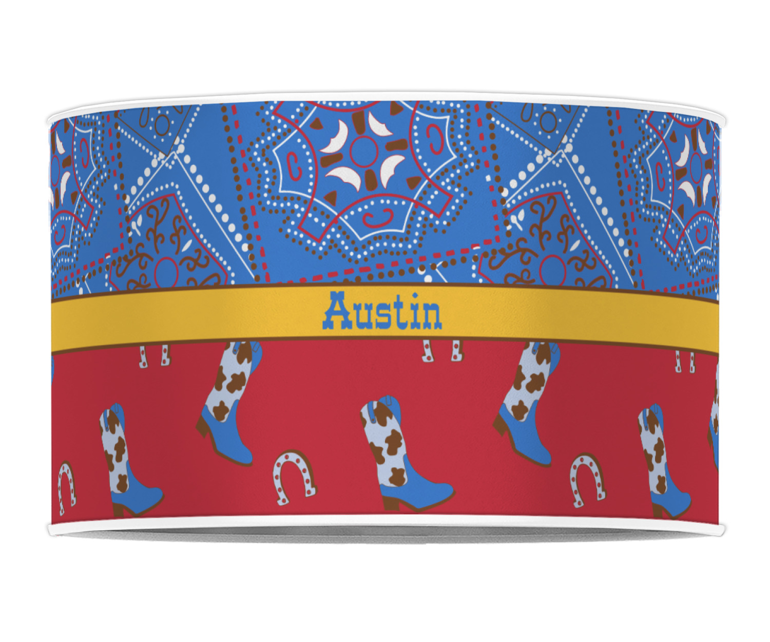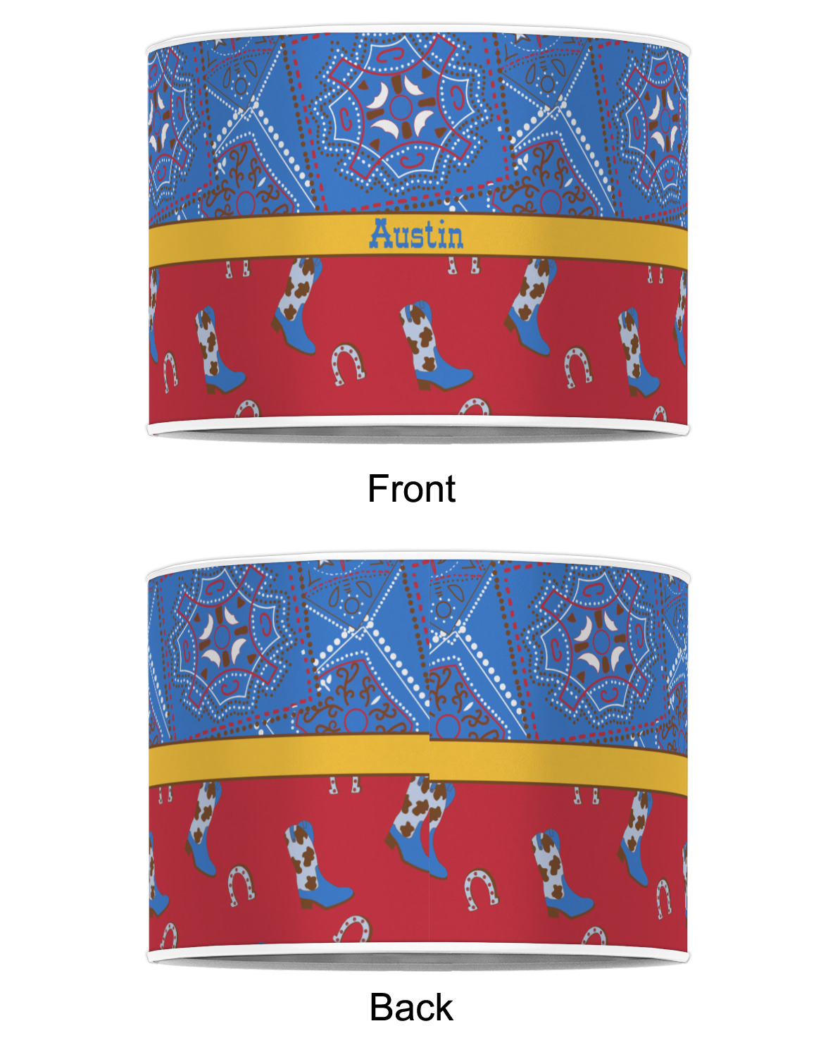 This design has a wild west theme and features a blue bandana print at the top half,and red with cowboy boots and horseshoes on the bottom. The coordinating design is blue, has a yellow ribbon and a sheriff's star in the middle, and cowboy hats and spurs in the background print.