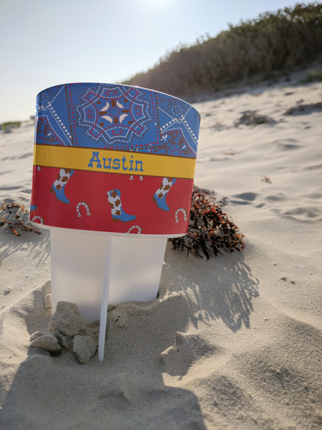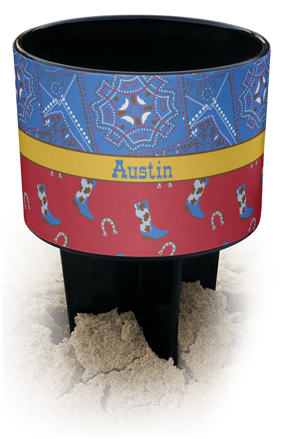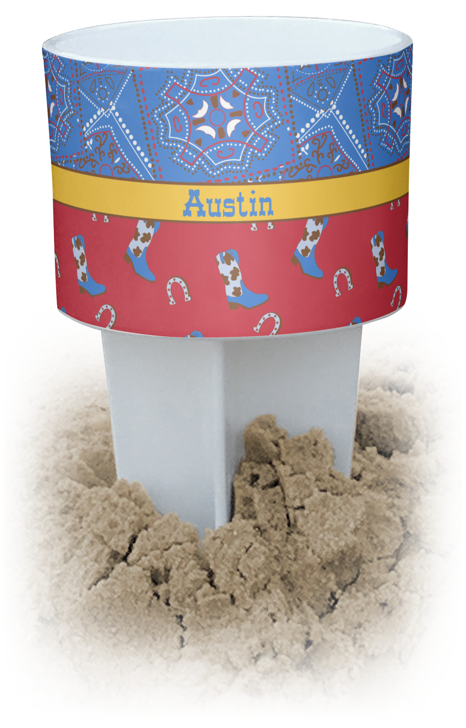 This cup holder has a large stake at its bottom that anchors it to the sand or ground below, while the cup holder rests above the stake. The entire drink holder is made of durable plastic and displays your customization around the cup holder portion. We sell these personalized beach spikers in two different colors: black and white.
