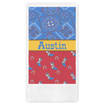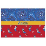 This design has a wild west theme and features a blue bandana print at the top half,and red with cowboy boots and horseshoes on the bottom. The coordinating design is blue, has a yellow ribbon and a sheriff's star in the middle, and cowboy hats and spurs in the background print.