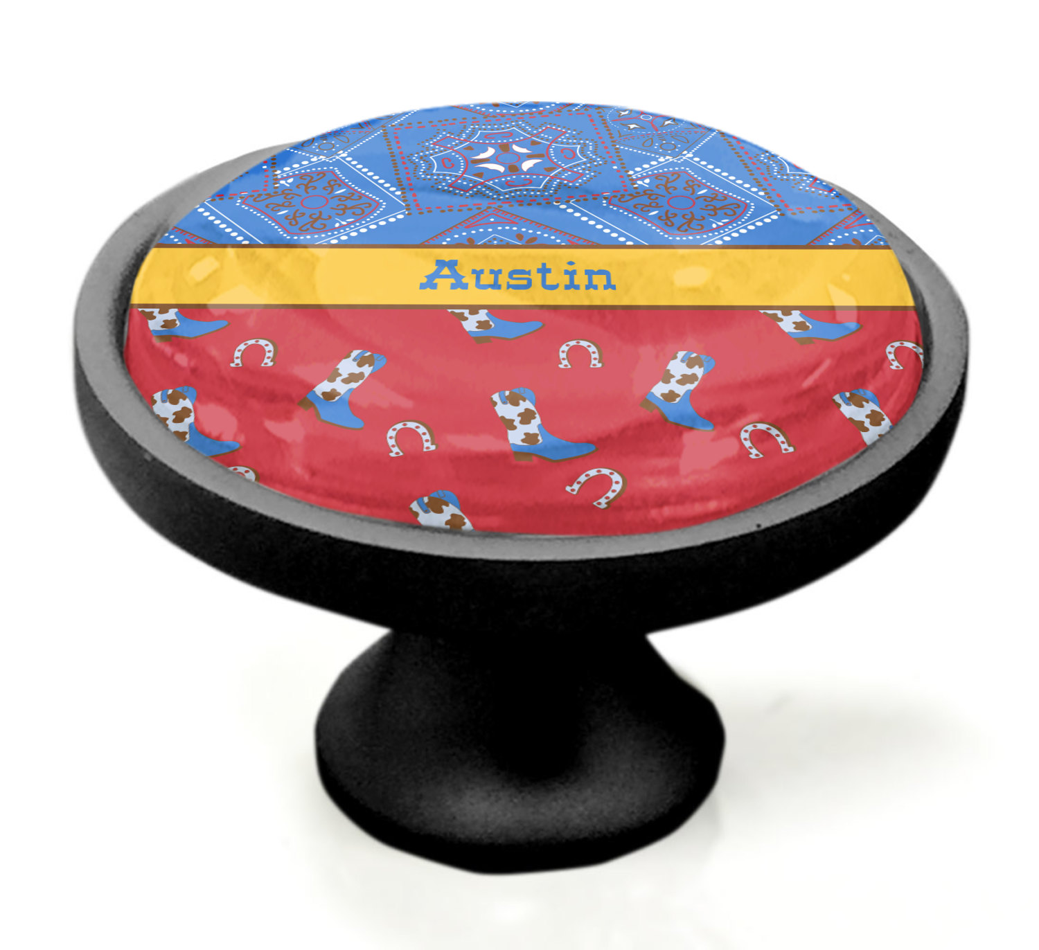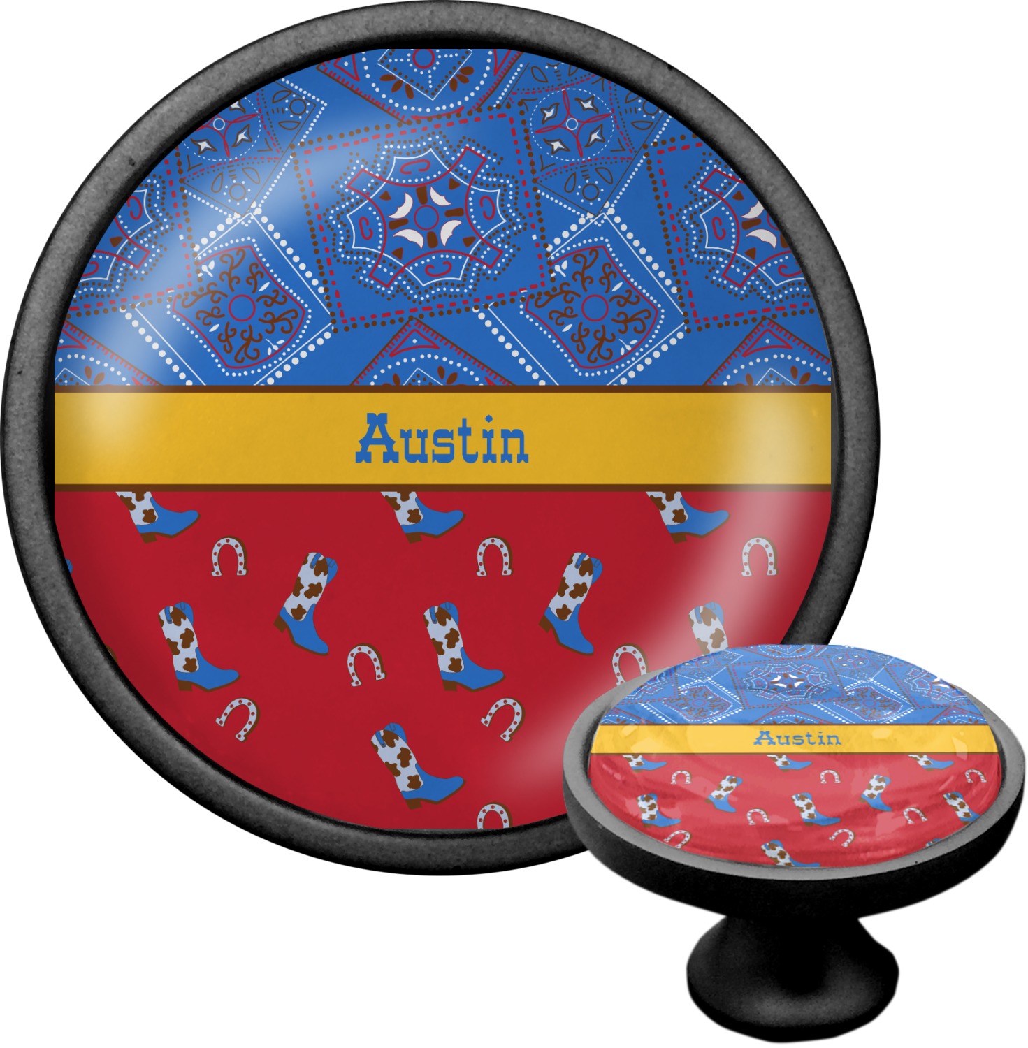 We sell these cabinet pulls in two different colors to better match your room's color scheme. We offer an oil-rubbed bronze base that is black in color, and a satin nickel option, which has a silver color. Your design is displayed across a high gloss vinyl insert that is placed on top of these cabinet handles. We then place a 1 inch thick glass cabochon atop the design, which seals the cabinet knob and makes the colors of your customization stand out. These custom cabinet knobs are approximately 1.3 inches in diameter. Your purchase includes a 1 inch screw that can be used to mount the knob to any cabinet in your home.