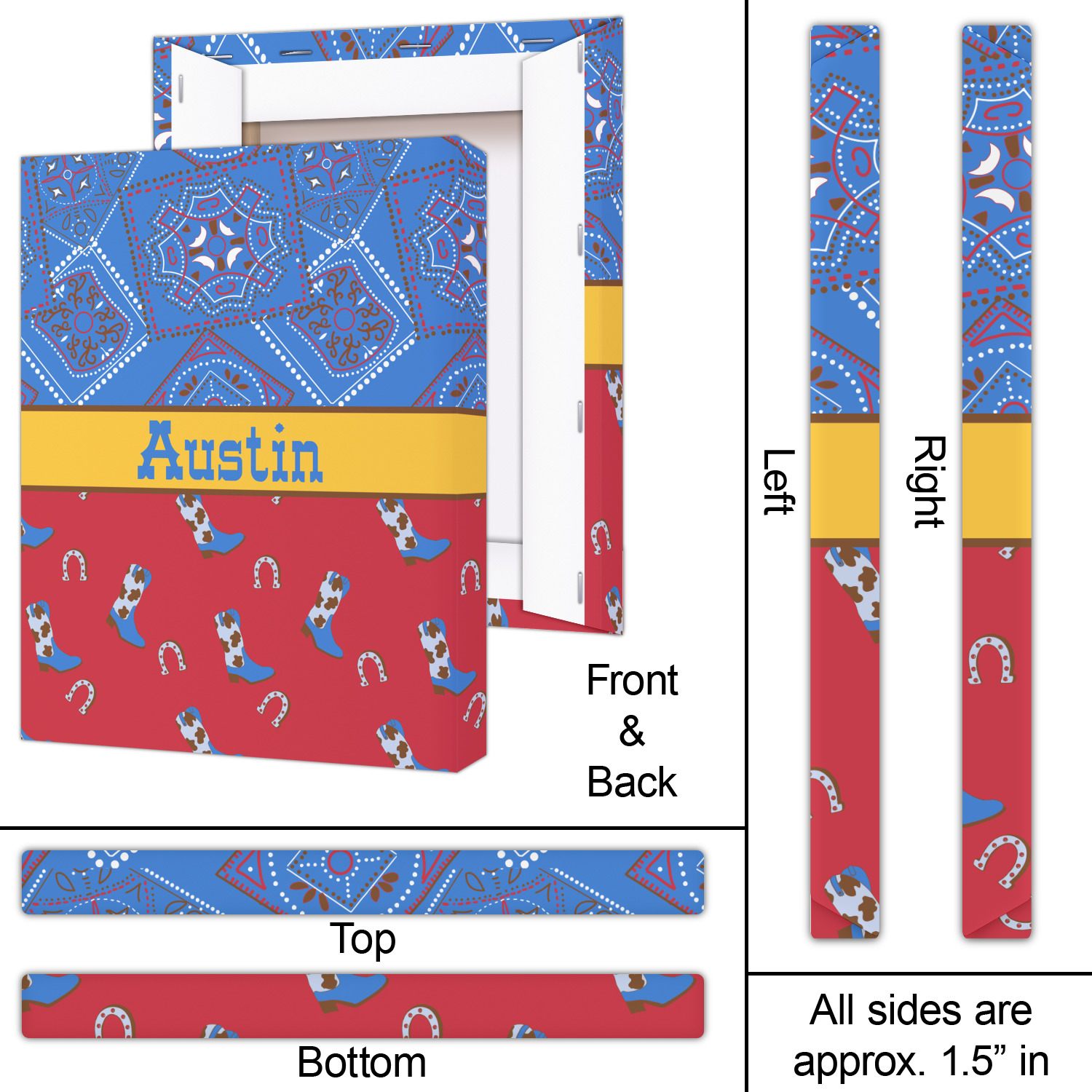 This design has a wild west theme and features a blue bandana print at the top half,and red with cowboy boots and horseshoes on the bottom. The coordinating design is blue, has a yellow ribbon and a sheriff's star in the middle, and cowboy hats and spurs in the background print.