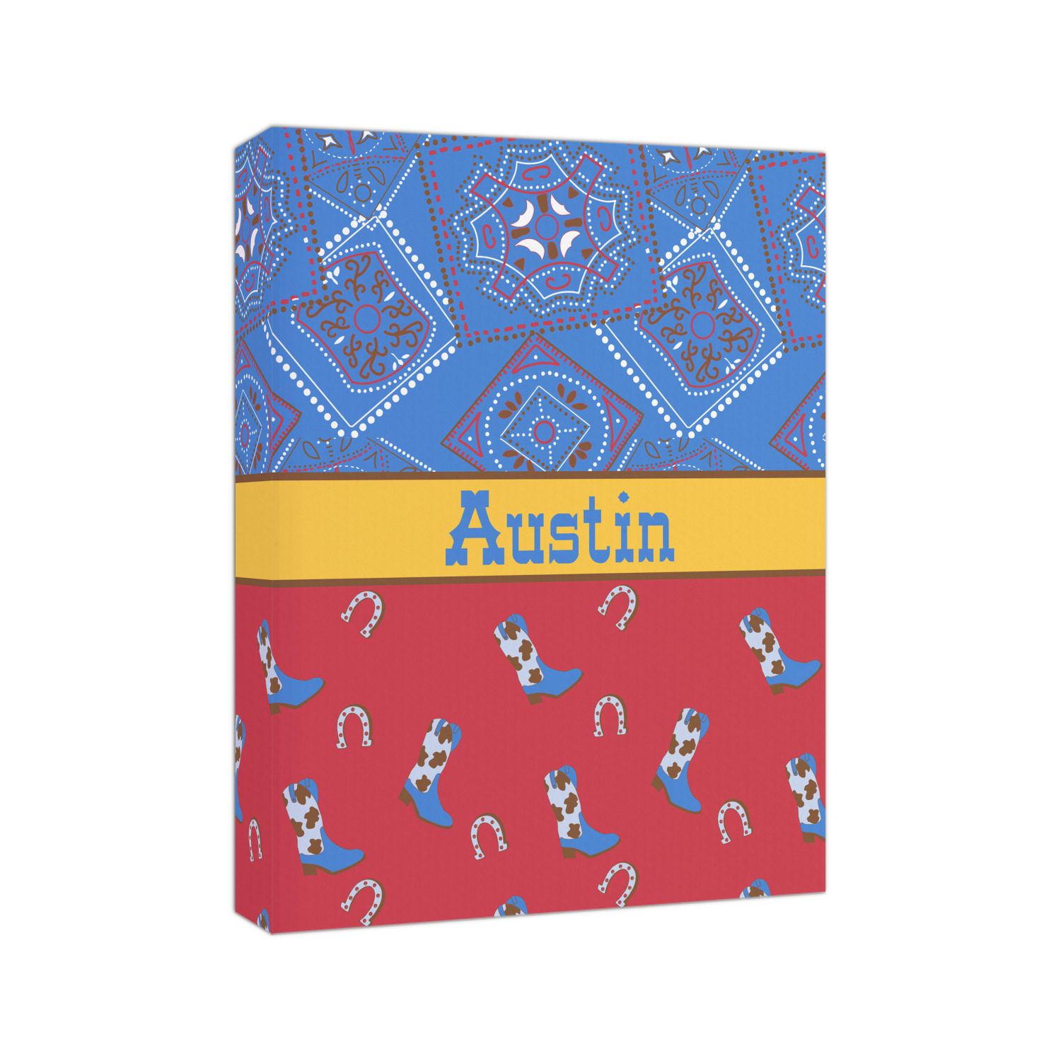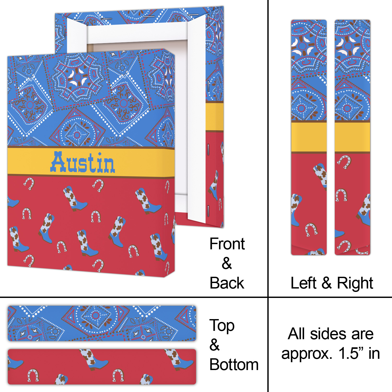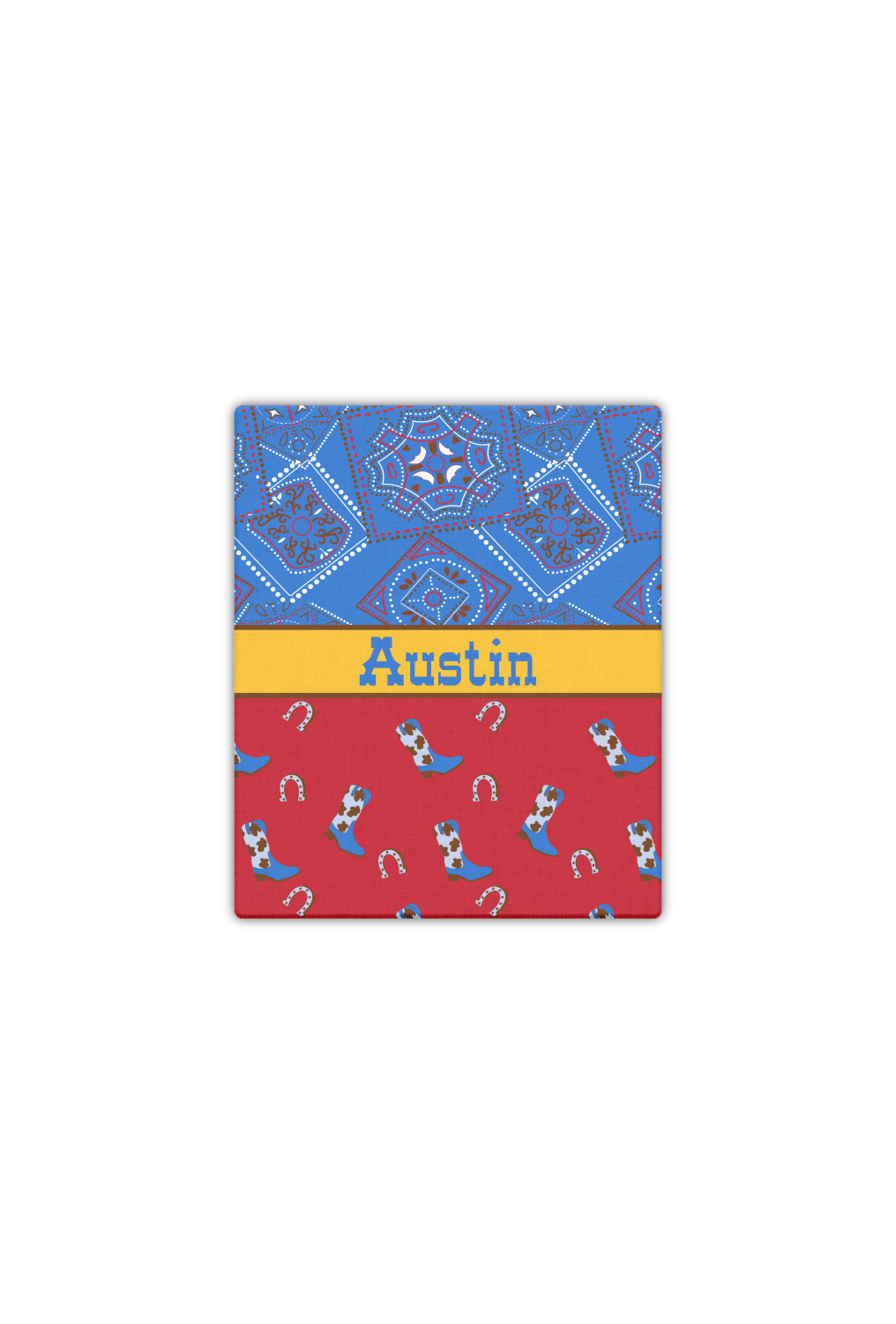 This design has a wild west theme and features a blue bandana print at the top half,and red with cowboy boots and horseshoes on the bottom. The coordinating design is blue, has a yellow ribbon and a sheriff's star in the middle, and cowboy hats and spurs in the background print.