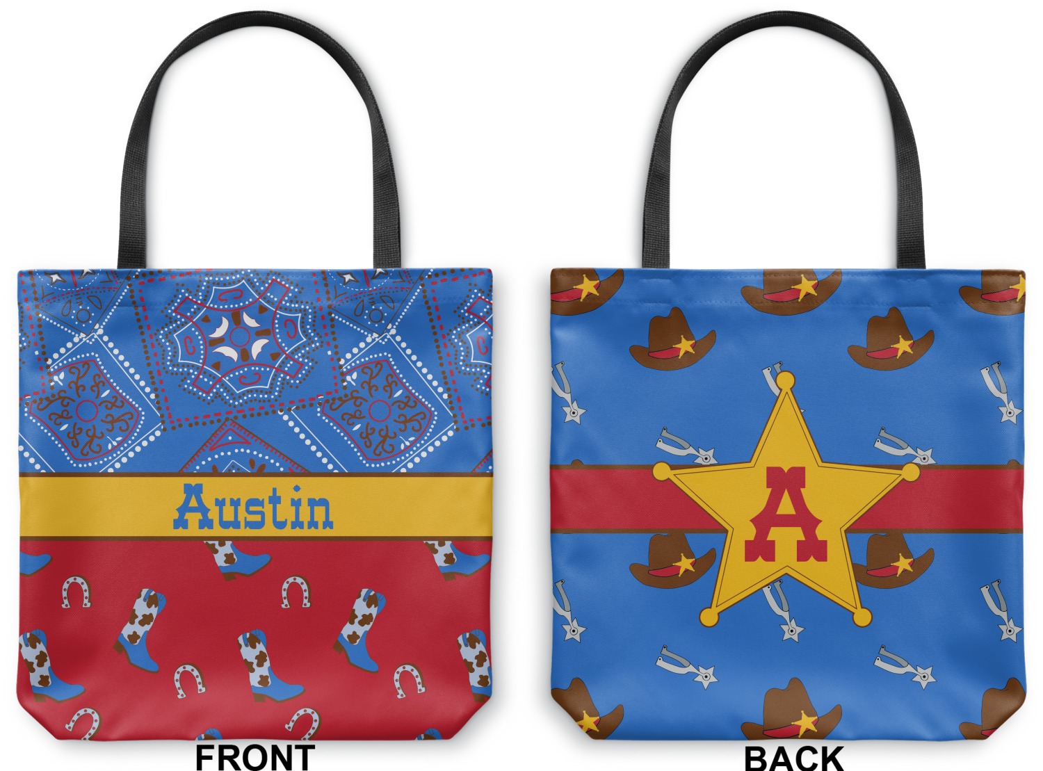 Our totes are made right here in the USA. Your design is printed on canvas fabric; the fabric is then cut and sewn on the sides and on the bottom to add an approximately 3.5 inch gusset. Black cotton handles are sewn in and reinforced. Your tote has a designs on both sides - the designs can be the same or different - the choice is yours. The inside of the tote has a black fused lining.