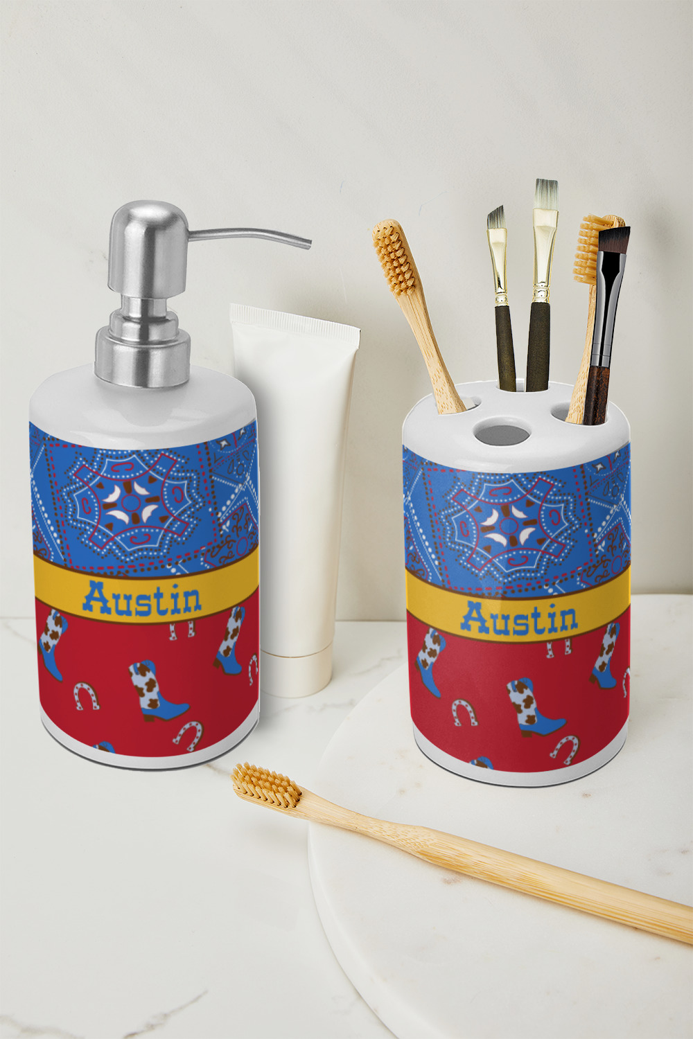 This two piece, ceramic bathroom set will add the perfect splash of color to any bathroom. This set includes one pump dispenser, ideal for soap or lotion, and one toothbrush holder with four holes. Although originally designed for toothbrushes, the holder will also hold make-up brushes, nail files, and other bathroom tools.