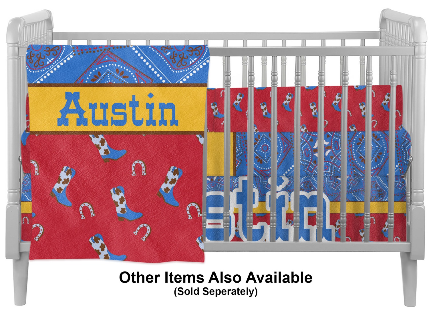This design has a wild west theme and features a blue bandana print at the top half,and red with cowboy boots and horseshoes on the bottom. The coordinating design is blue, has a yellow ribbon and a sheriff's star in the middle, and cowboy hats and spurs in the background print.