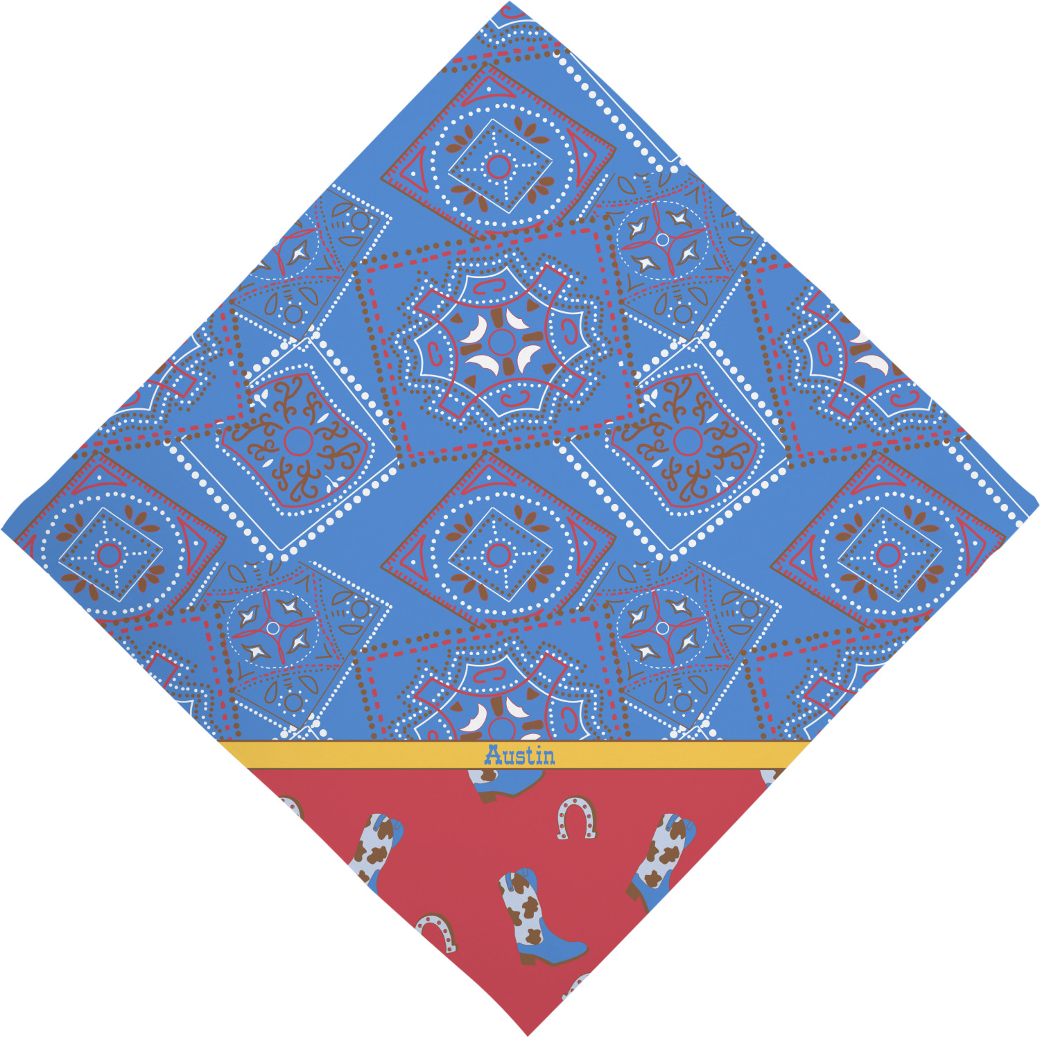 This beautiful pet bandana really is the perfect accessory. It is made from a silky feeling polyester and measures at approximately 23" x 23". Your personalization will be printed on a diagonal, so that you are able to read the personalization when folded into a triangle. This bandana fits best on large dogs, but can be folded smaller if there is no personalized text to fit smaller pets.
