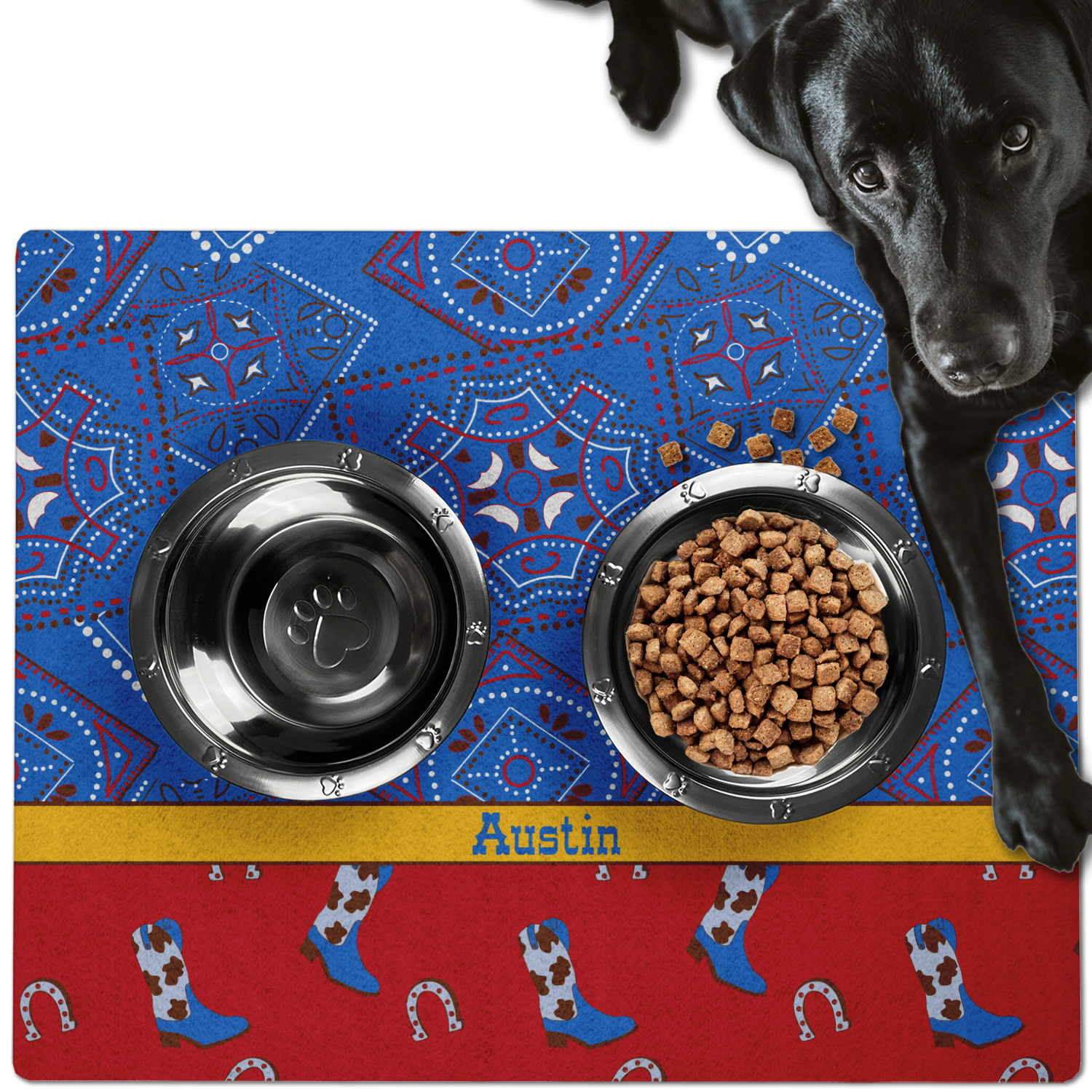 This dog bowl mat, fabricated from polyester, proudly displays your customized design on its top, while its bottom includes a non-slip rubber. This feature allows it to remain firmly in place, even when your dog spills his/her water. With 3 sizes available (18" x 12", 24" x 18", 30" x 24"), the pet food mat has ample space for both a food and water bowl for any sized dogs. Though specified for dogs' use, these mats are also a splendid option for cats.