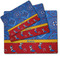 This design has a wild west theme and features a blue bandana print at the top half,and red with cowboy boots and horseshoes on the bottom. The coordinating design is blue, has a yellow ribbon and a sheriff's star in the middle, and cowboy hats and spurs in the background print.