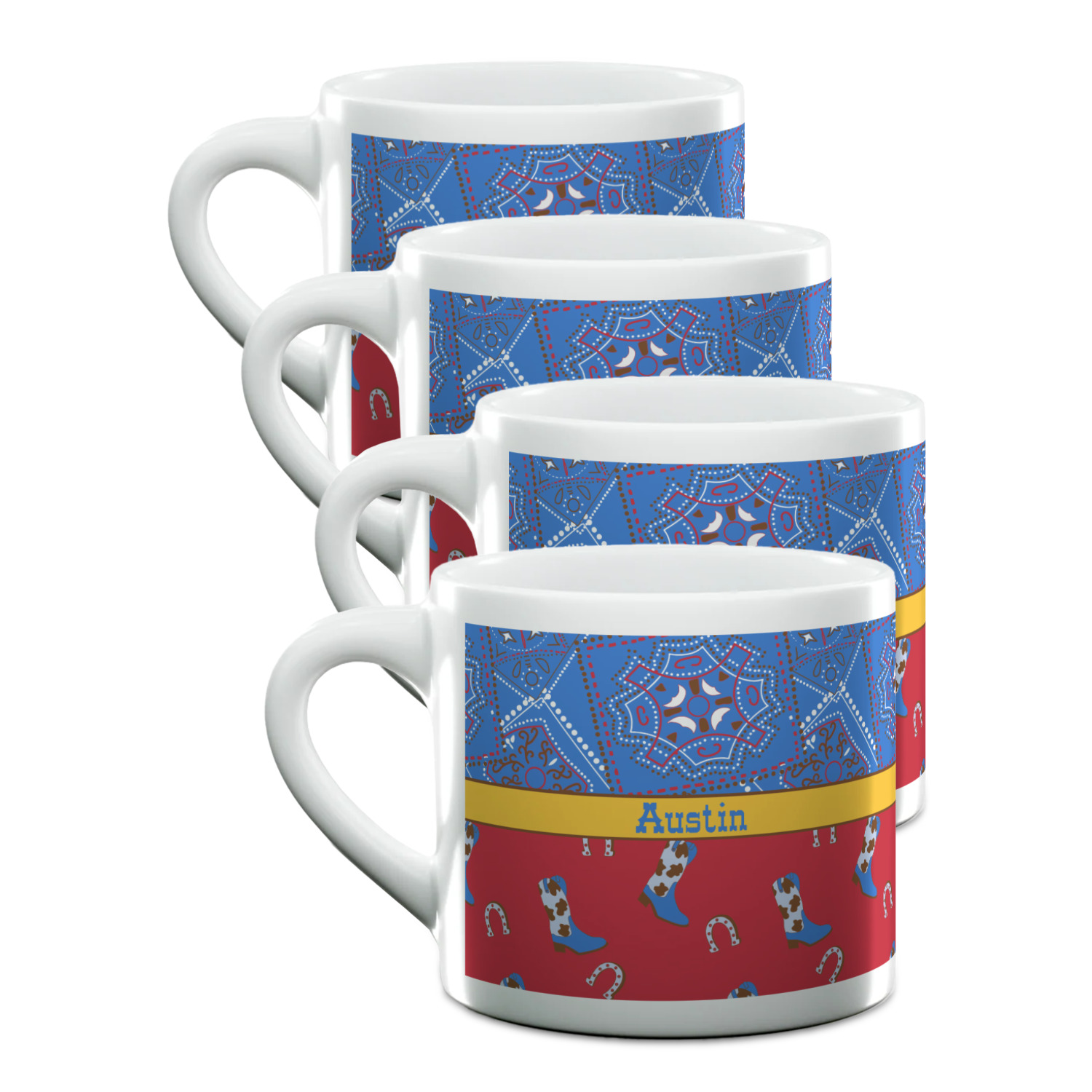 Each of our espresso mugs is a ceramic material sure to keep your drink warm. Personalize one cup for yourself, or order a set of 4! Its the perfect little gift for any coffee lover! We carry two sizes for you to personalize - 3 oz. (approx. 3.25" x 2.325" x 2.625") or 6 oz. (approx. 4" x 2.9" x 2.9"). Our 3 oz. mug is perfect for that single shot espresso while our 6 oz. mug can be your next favorite cappuccino cup holding two shots of espresso!
