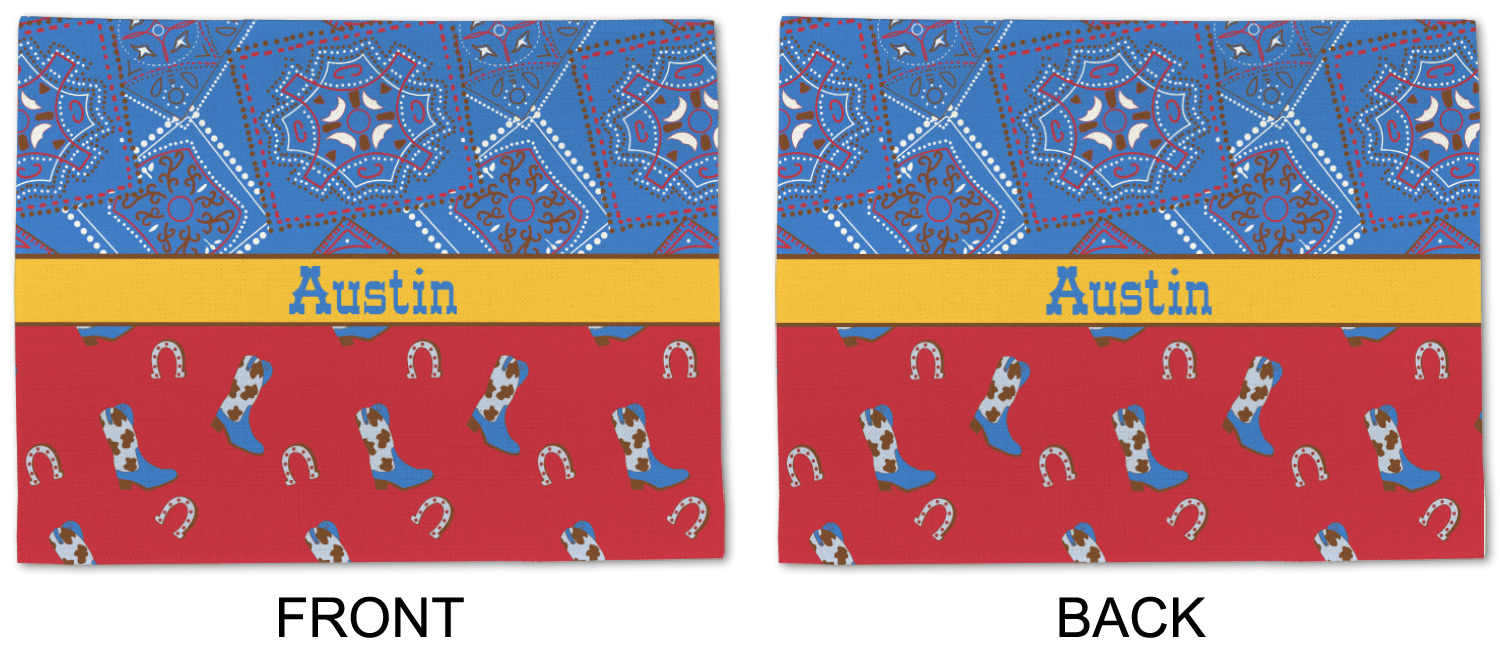 This design has a wild west theme and features a blue bandana print at the top half,and red with cowboy boots and horseshoes on the bottom. The coordinating design is blue, has a yellow ribbon and a sheriff's star in the middle, and cowboy hats and spurs in the background print.