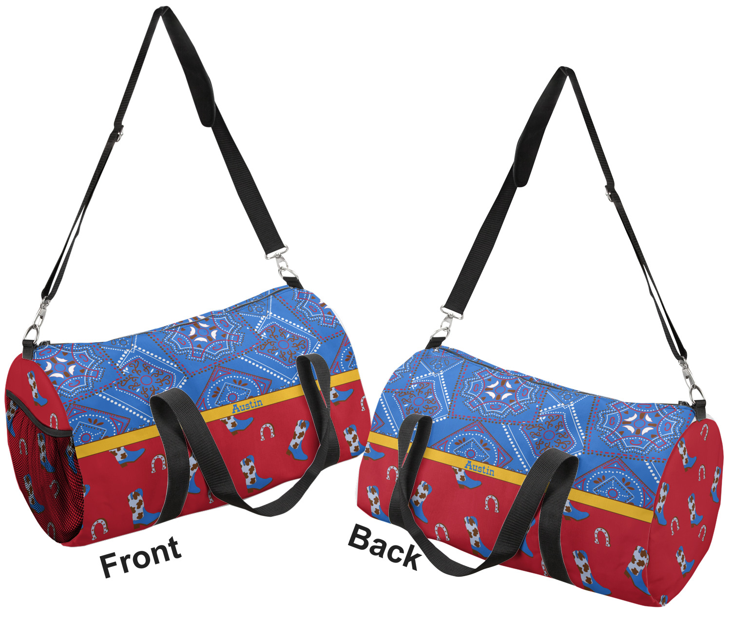 This duffle is a sturdy bag made of a canvas material. It comes in two sizes: Small (19"W x 9.5"H x 9.5"D) and Large (23"W x 12"H x 12"D). The bag is a cylindrical shape with a black adjustable strap and two handles. On one side is an elastic pouch to put a waterbottle or other small item. Your product will be sublimated with your design and is able to be designed on the front, back, and sides. Be sure to remember that the straps may cut into parts of your design if you upload your own artwork.