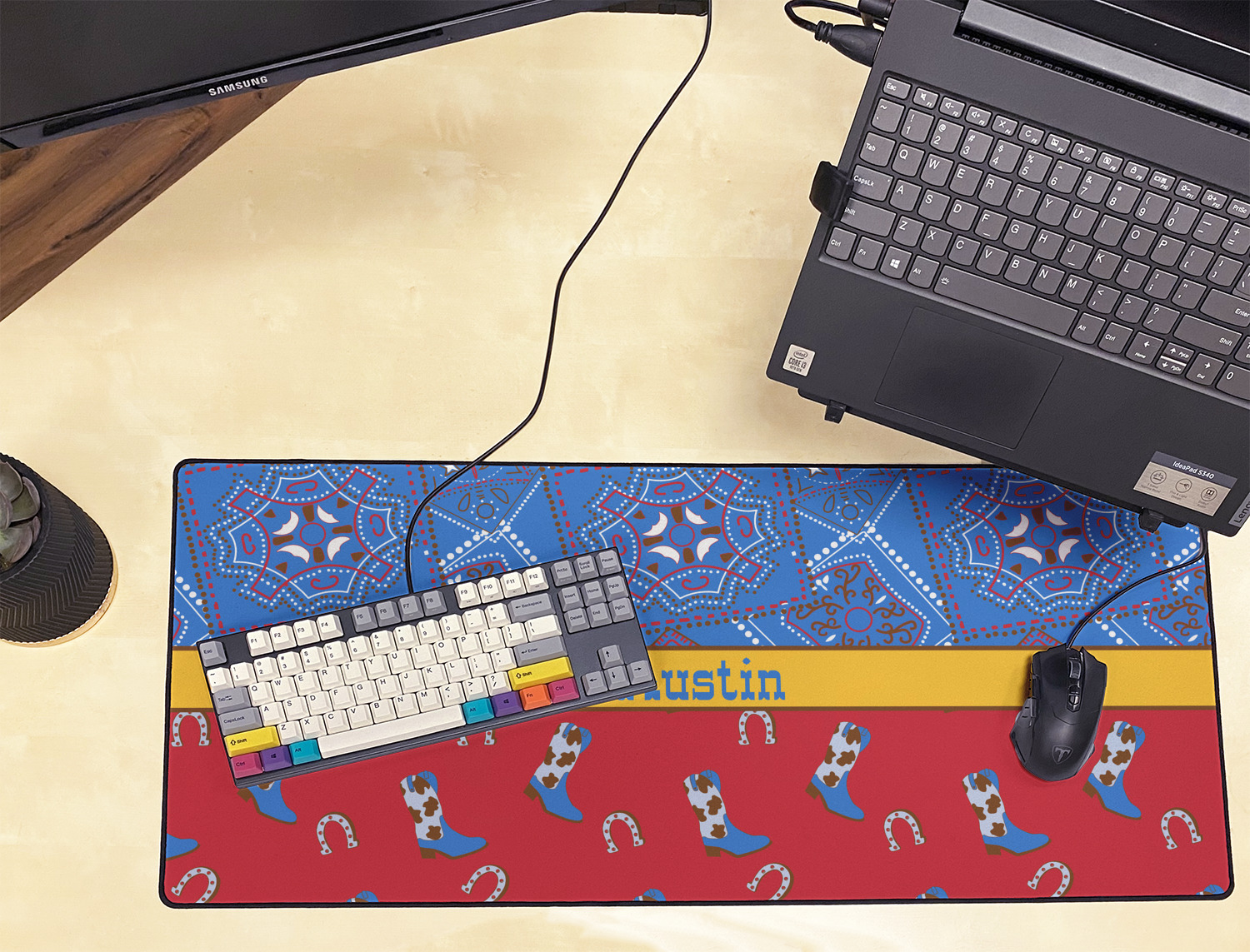 This design has a wild west theme and features a blue bandana print at the top half,and red with cowboy boots and horseshoes on the bottom. The coordinating design is blue, has a yellow ribbon and a sheriff's star in the middle, and cowboy hats and spurs in the background print.