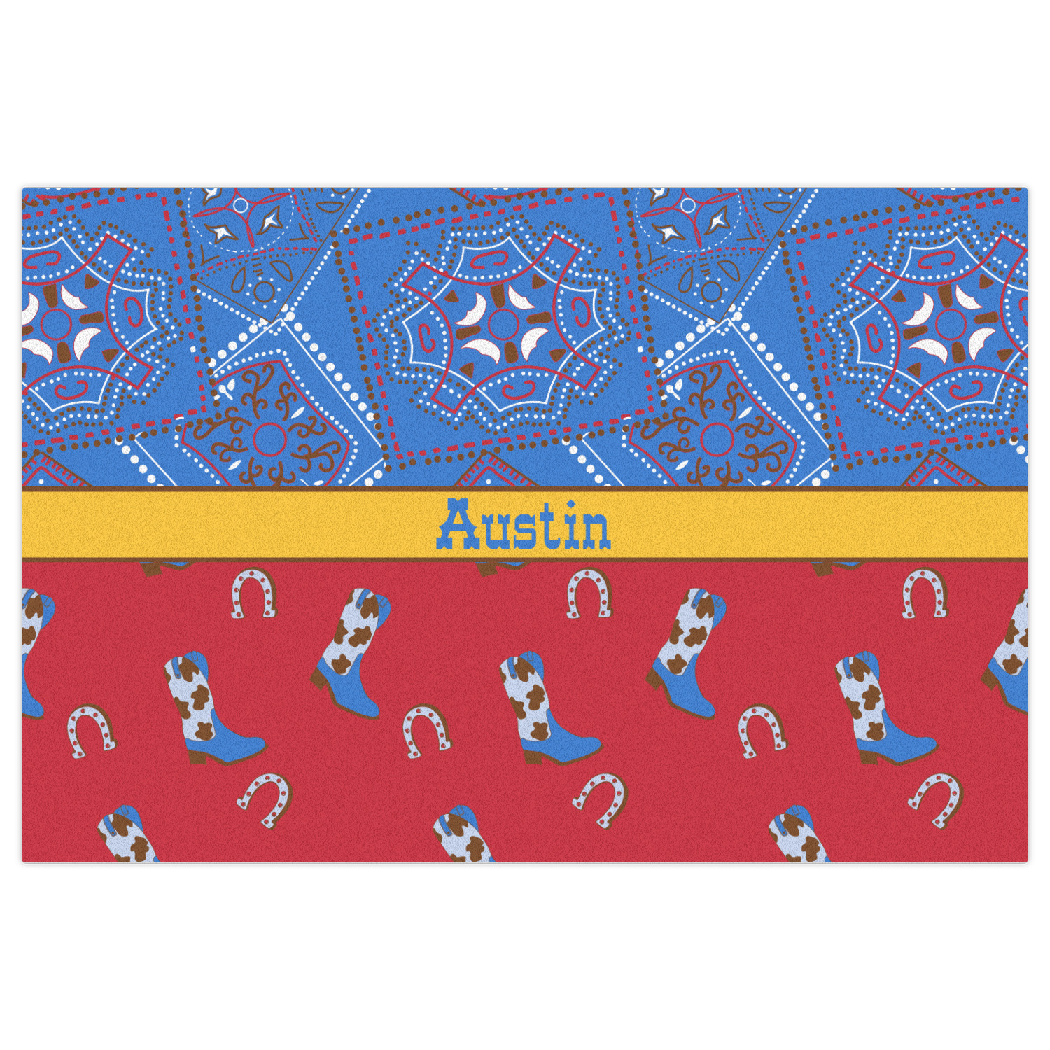 This design has a wild west theme and features a blue bandana print at the top half,and red with cowboy boots and horseshoes on the bottom. The coordinating design is blue, has a yellow ribbon and a sheriff's star in the middle, and cowboy hats and spurs in the background print.