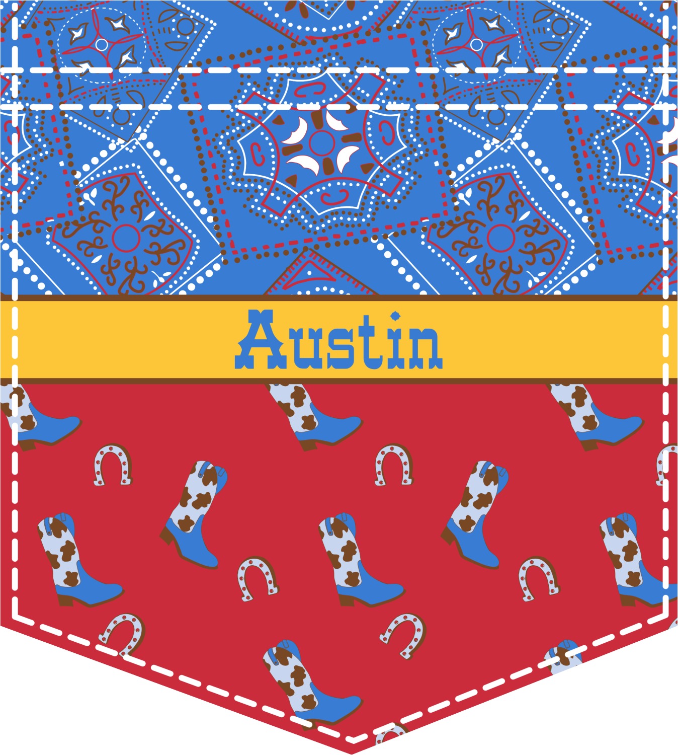 This design has a wild west theme and features a blue bandana print at the top half,and red with cowboy boots and horseshoes on the bottom. The coordinating design is blue, has a yellow ribbon and a sheriff's star in the middle, and cowboy hats and spurs in the background print.