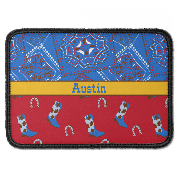 This design has a wild west theme and features a blue bandana print at the top half,and red with cowboy boots and horseshoes on the bottom. The coordinating design is blue, has a yellow ribbon and a sheriff's star in the middle, and cowboy hats and spurs in the background print.