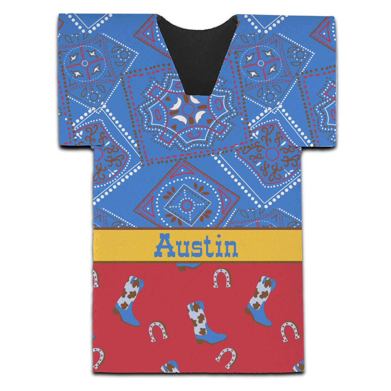 This design has a wild west theme and features a blue bandana print at the top half,and red with cowboy boots and horseshoes on the bottom. The coordinating design is blue, has a yellow ribbon and a sheriff's star in the middle, and cowboy hats and spurs in the background print.