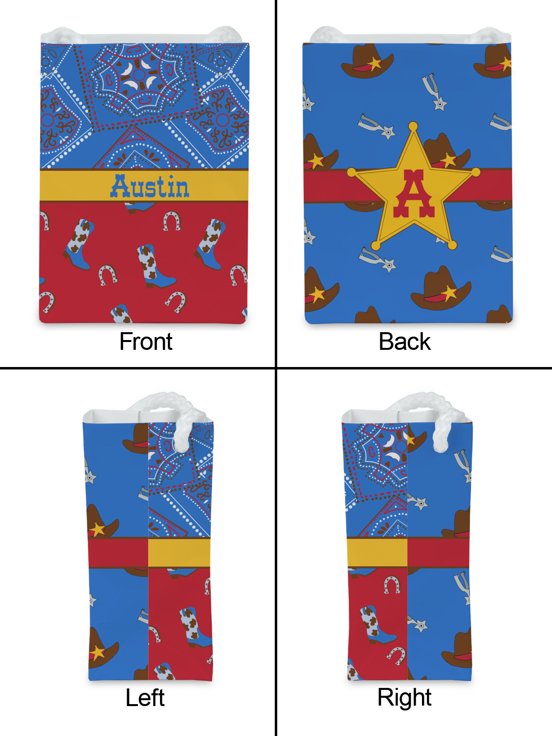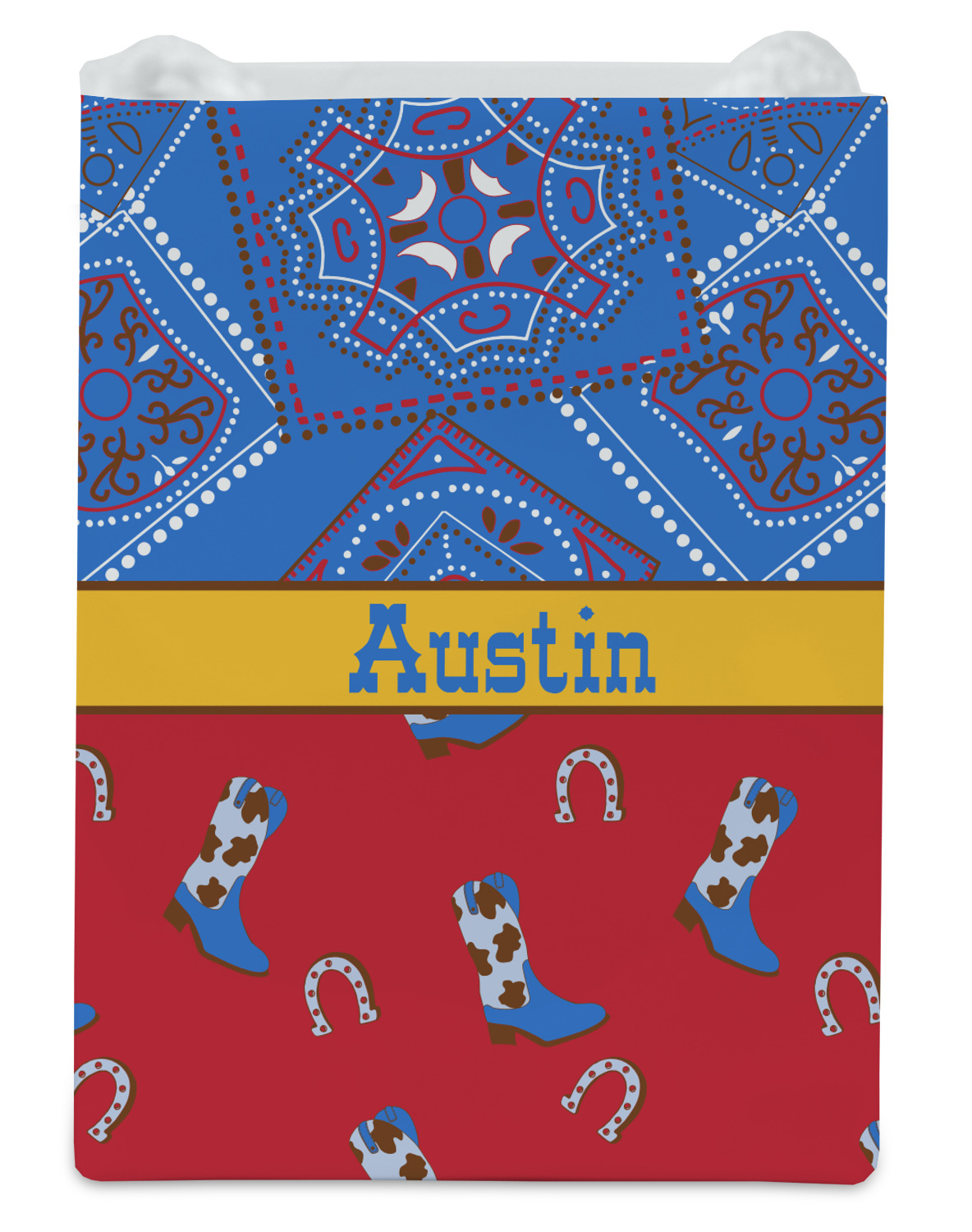 This design has a wild west theme and features a blue bandana print at the top half,and red with cowboy boots and horseshoes on the bottom. The coordinating design is blue, has a yellow ribbon and a sheriff's star in the middle, and cowboy hats and spurs in the background print.