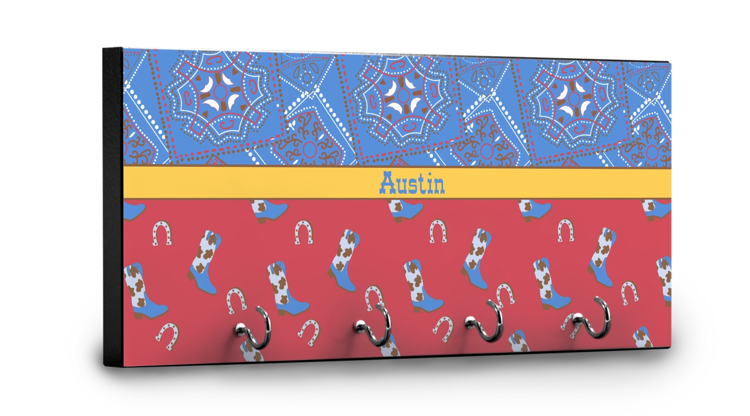 This 11" x 5" key hanger is made of sturdy wood and has four metal hooks lining the bottom. This is the perfect size for a family with several drivers. Not only can you hang keys on it though, but pet leashes and other small items. The board is black on the sides and back and is printed with the design of your choice on the front.