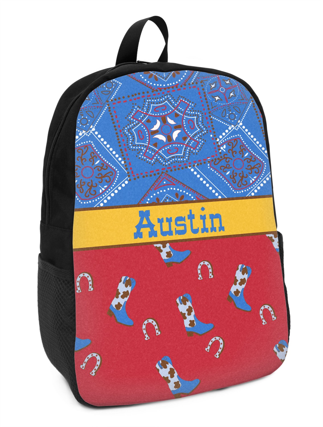 These small backpacks are made of a durable black canvas material with your personalization right on the front. The two shoulder straps are padded and easily adjustable. The bag itself measures at about 11" W x 15" H x 5" D. It's the perfect size for elementary aged kids or adults who want a smaller backpack. On the top of the bag you will find a handle to hang or carry your backpack by as well as a large zipper closure to keep all of your belongings safe inside. On each side of your backpack is a mesh pocket for a small item or water bottle. Inside your backpack you will find a spacious area with a small zipper pocket and a padded laptop slot that will fit up to a 13" laptop (13" being very snug). This is the perfect bag for any student that needs a couple books and their laptop with them at all times. It also works great as a carry on for traveling!