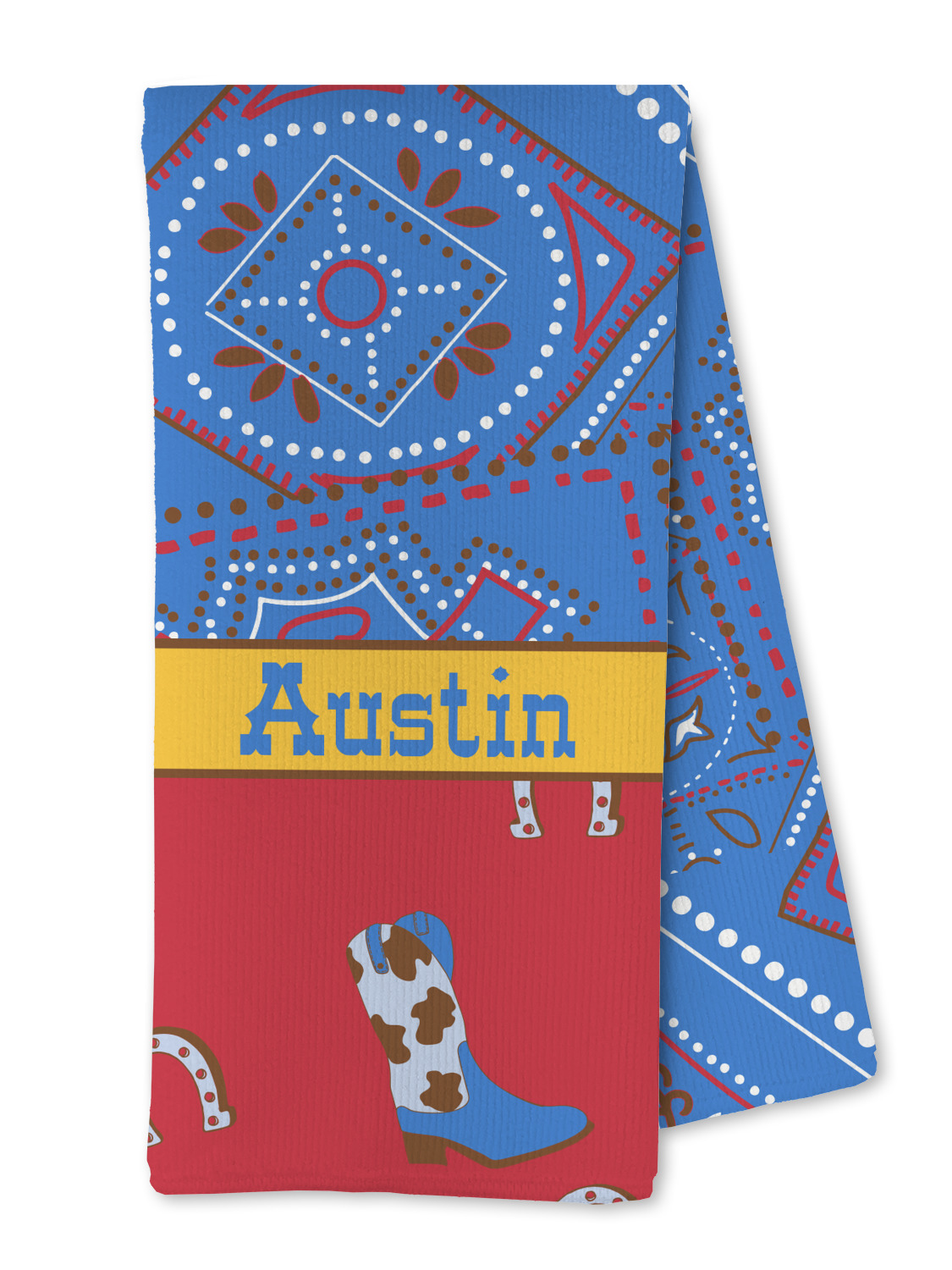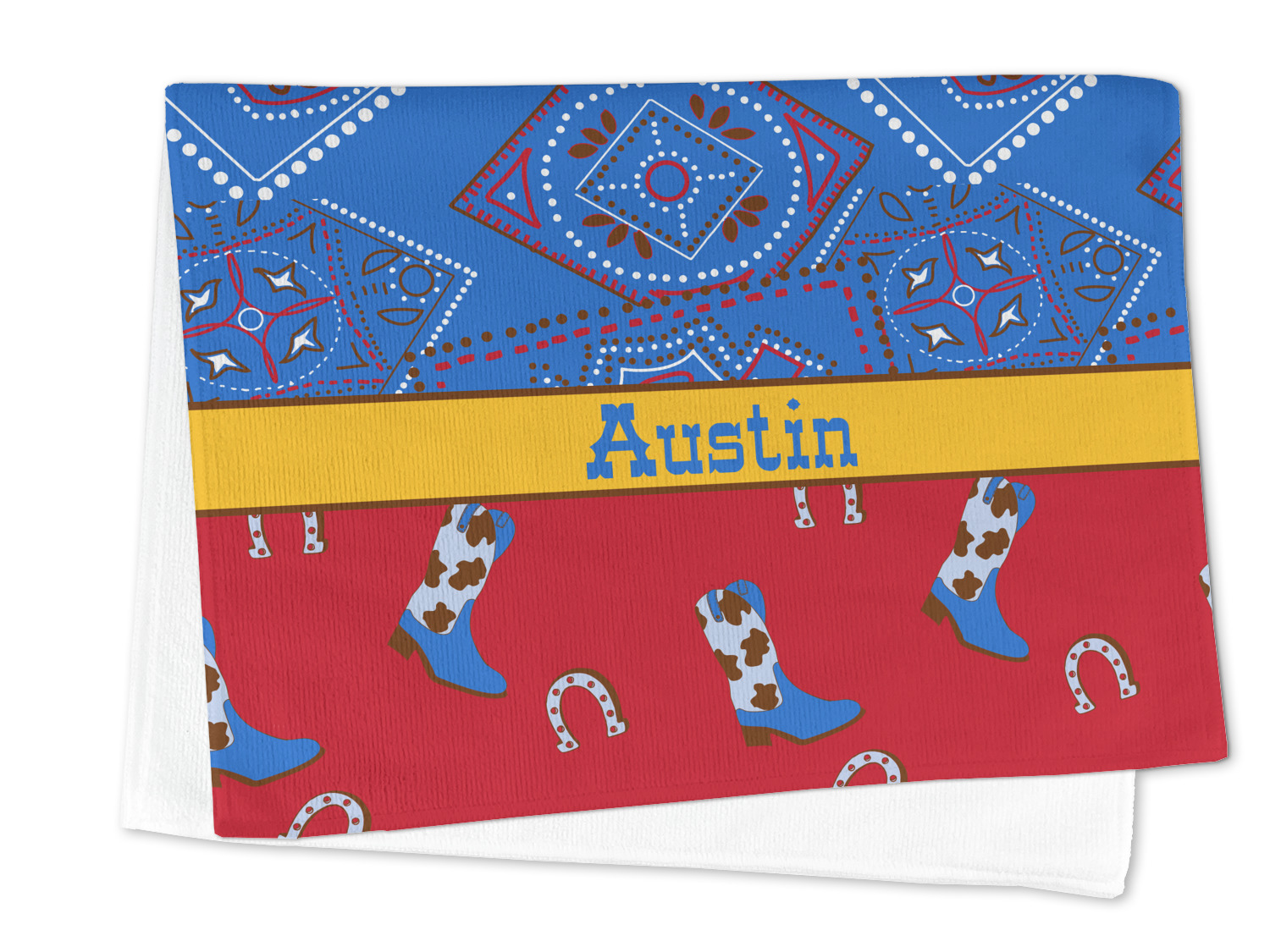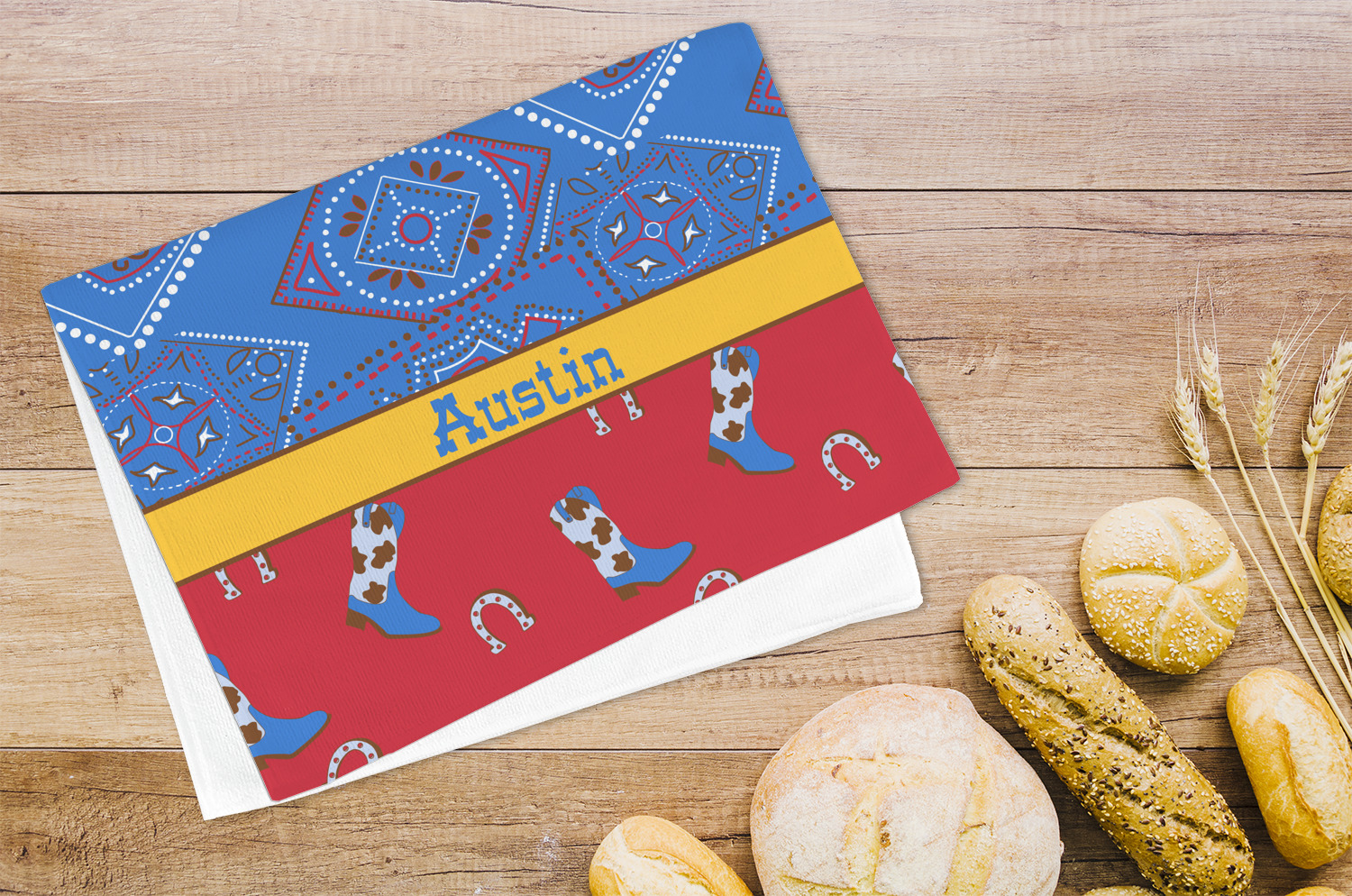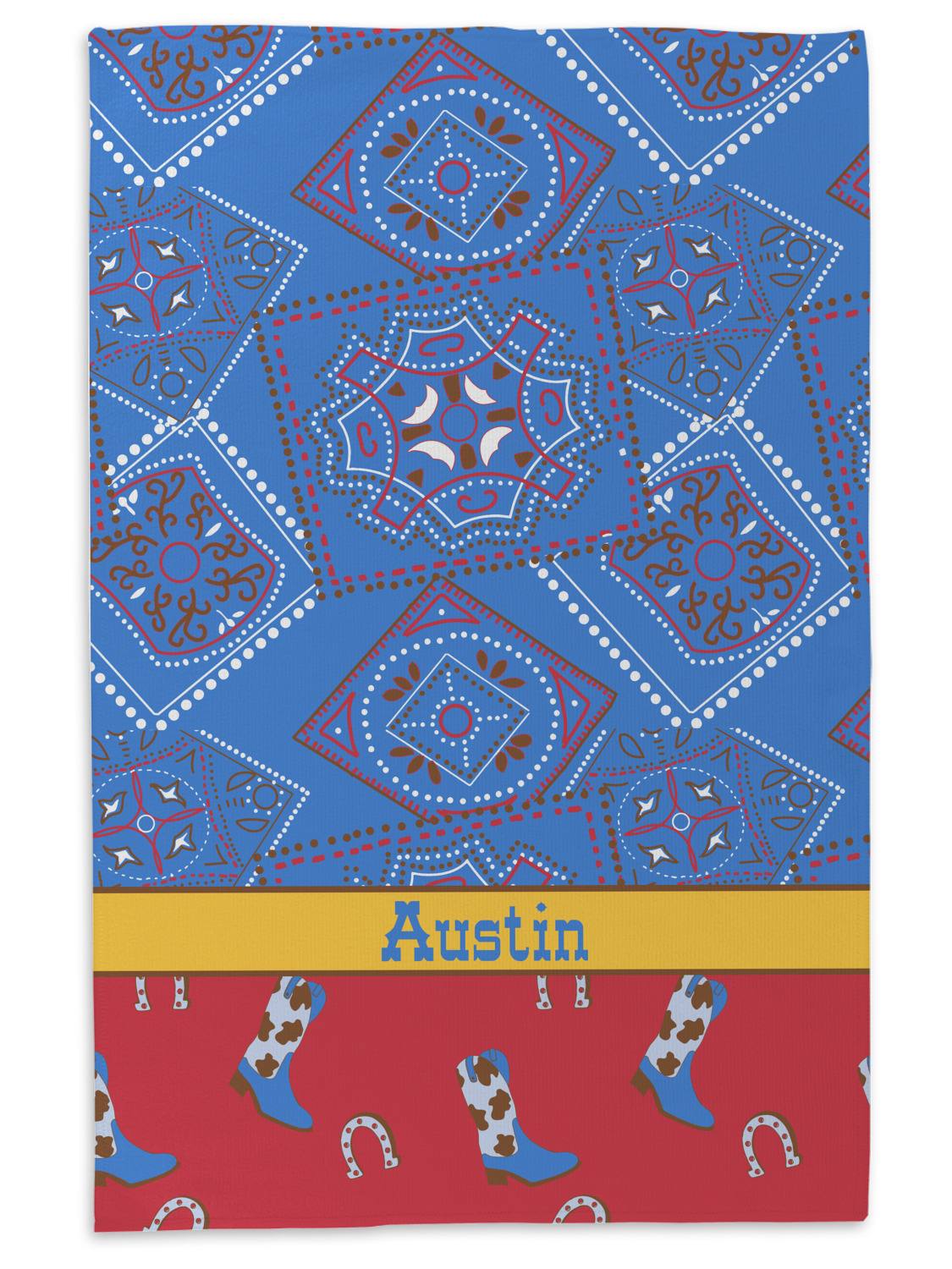 This design has a wild west theme and features a blue bandana print at the top half,and red with cowboy boots and horseshoes on the bottom. The coordinating design is blue, has a yellow ribbon and a sheriff's star in the middle, and cowboy hats and spurs in the background print.