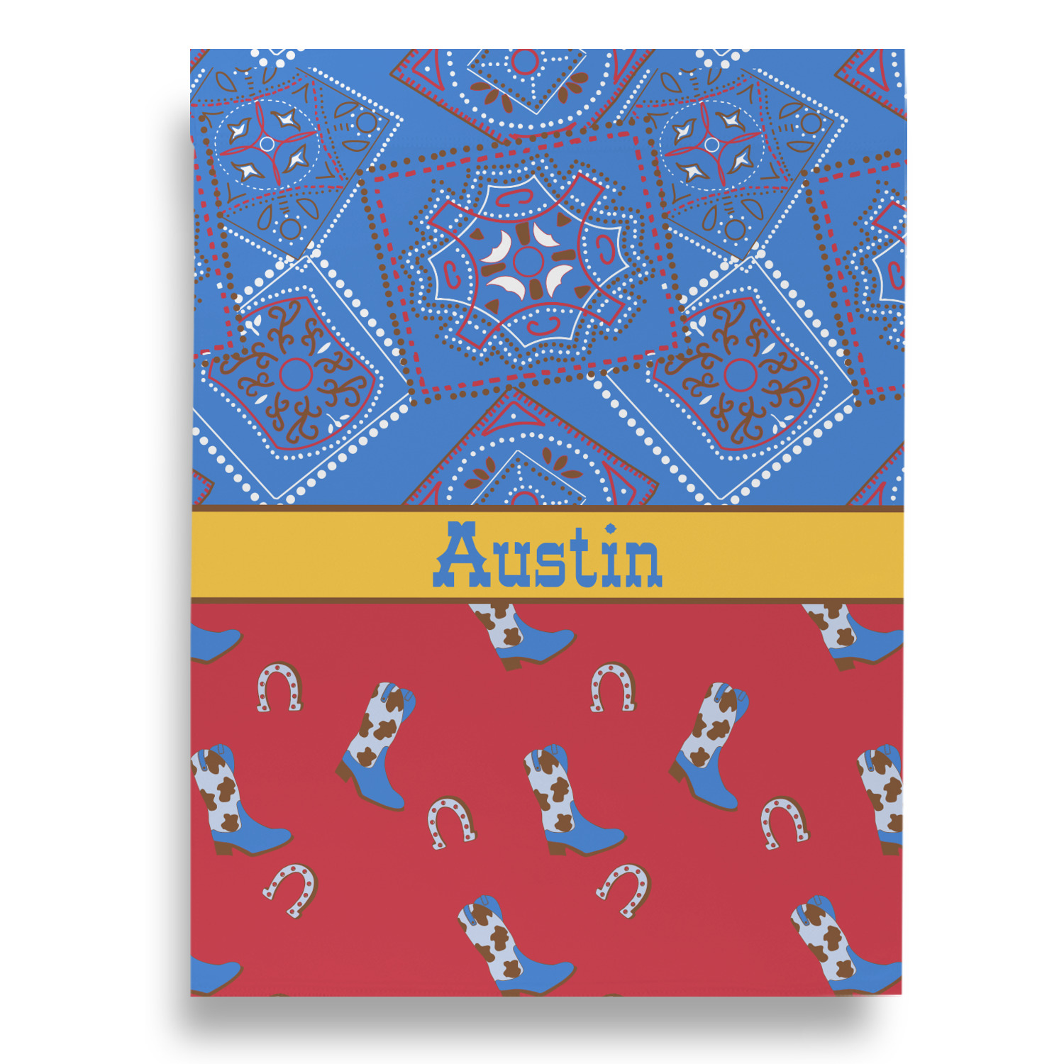 This design has a wild west theme and features a blue bandana print at the top half,and red with cowboy boots and horseshoes on the bottom. The coordinating design is blue, has a yellow ribbon and a sheriff's star in the middle, and cowboy hats and spurs in the background print.
