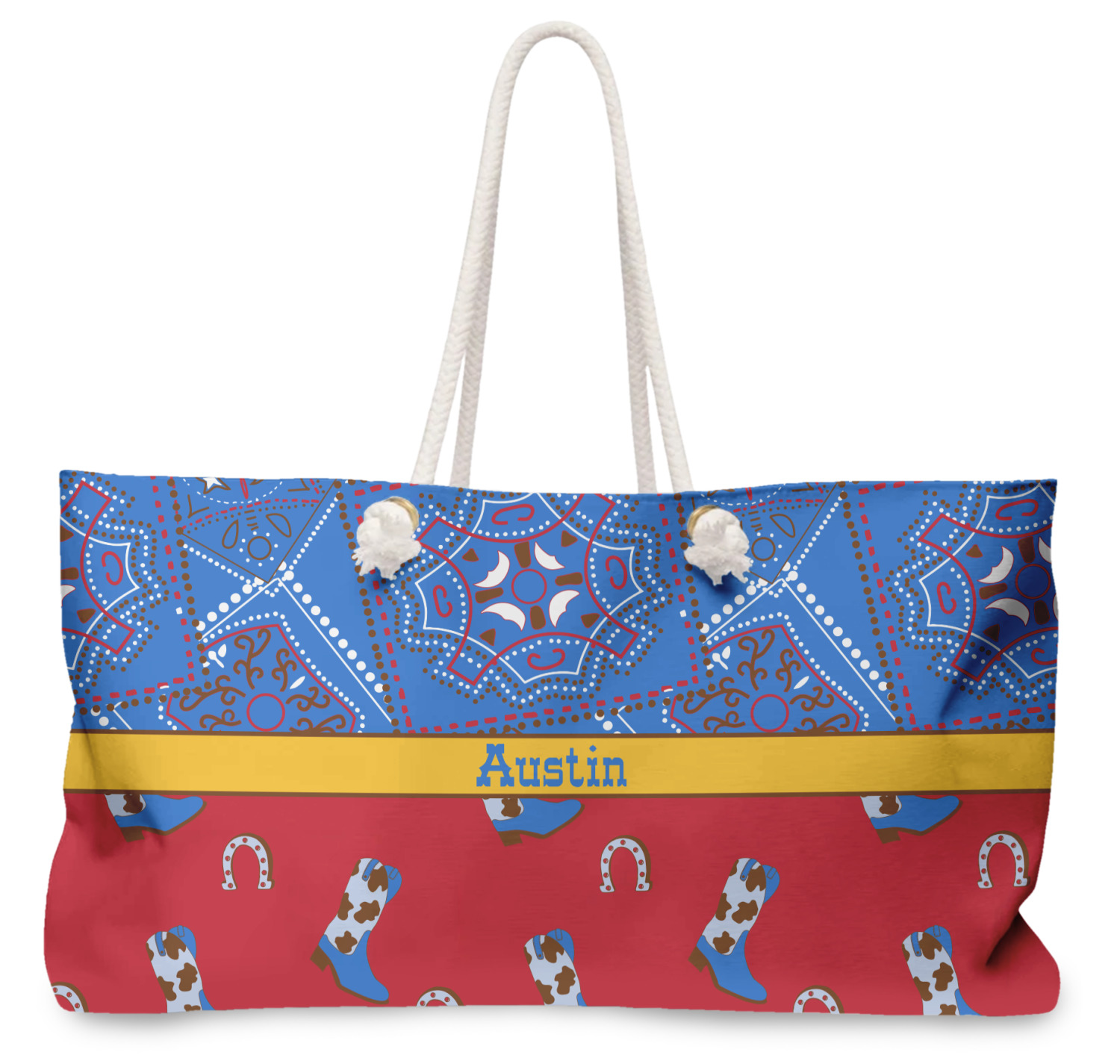 Our oversized weekender tote with rope handles is perfect for your weekend at the beach or on the town. This large tote are 24" W X 13" H, with a 5" gusset and a 27" thick rope handles with a knot that is put through a grommeted brass hole.